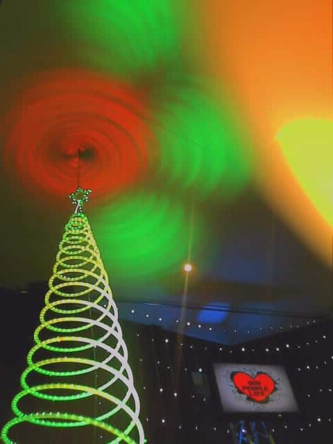 They built the Christmas trees on the sides from standard rope light trees. They just hung them from the ceiling rather than using the floor frame that came with them.