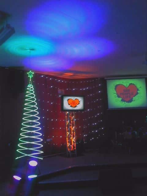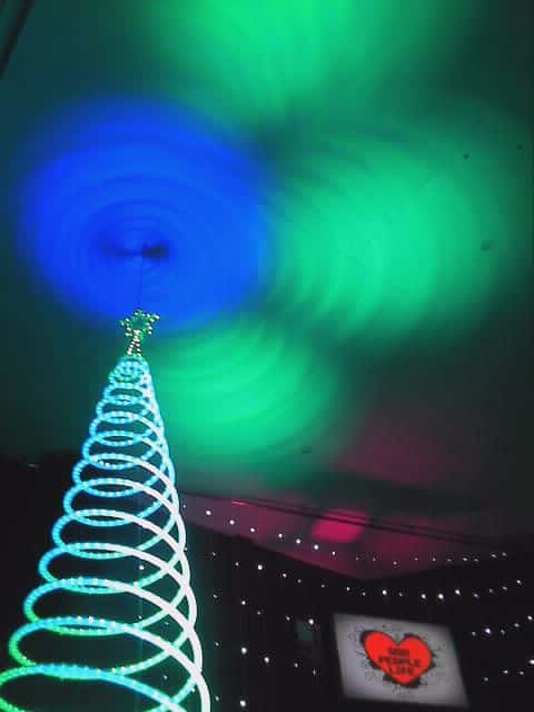 They used 4 LED P64 cans at the base of each tree creating two effects. The first was on the white plastic stripping on the underside of the rope light and then on the roof, creating a cool spiraling effect.