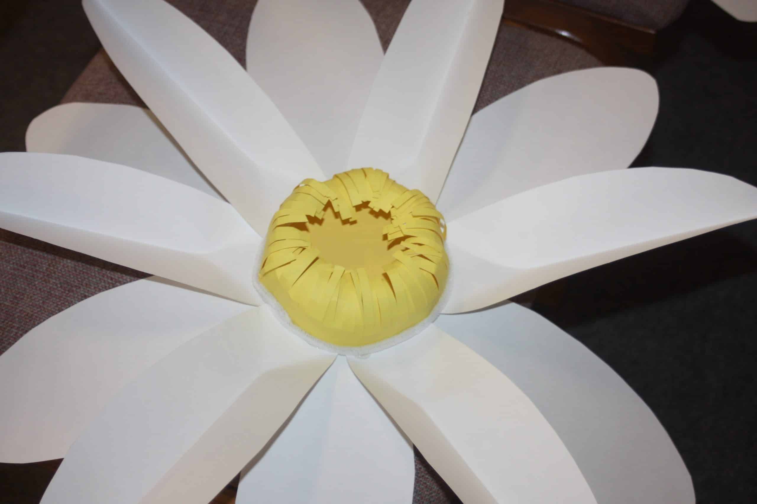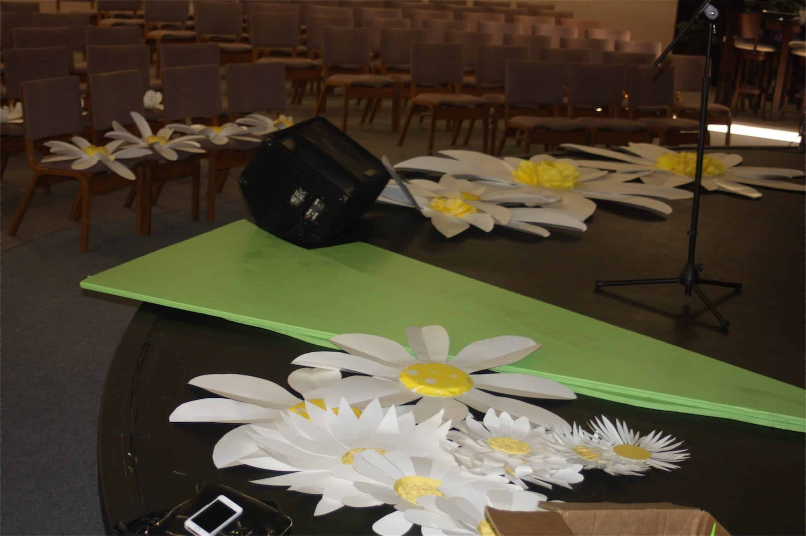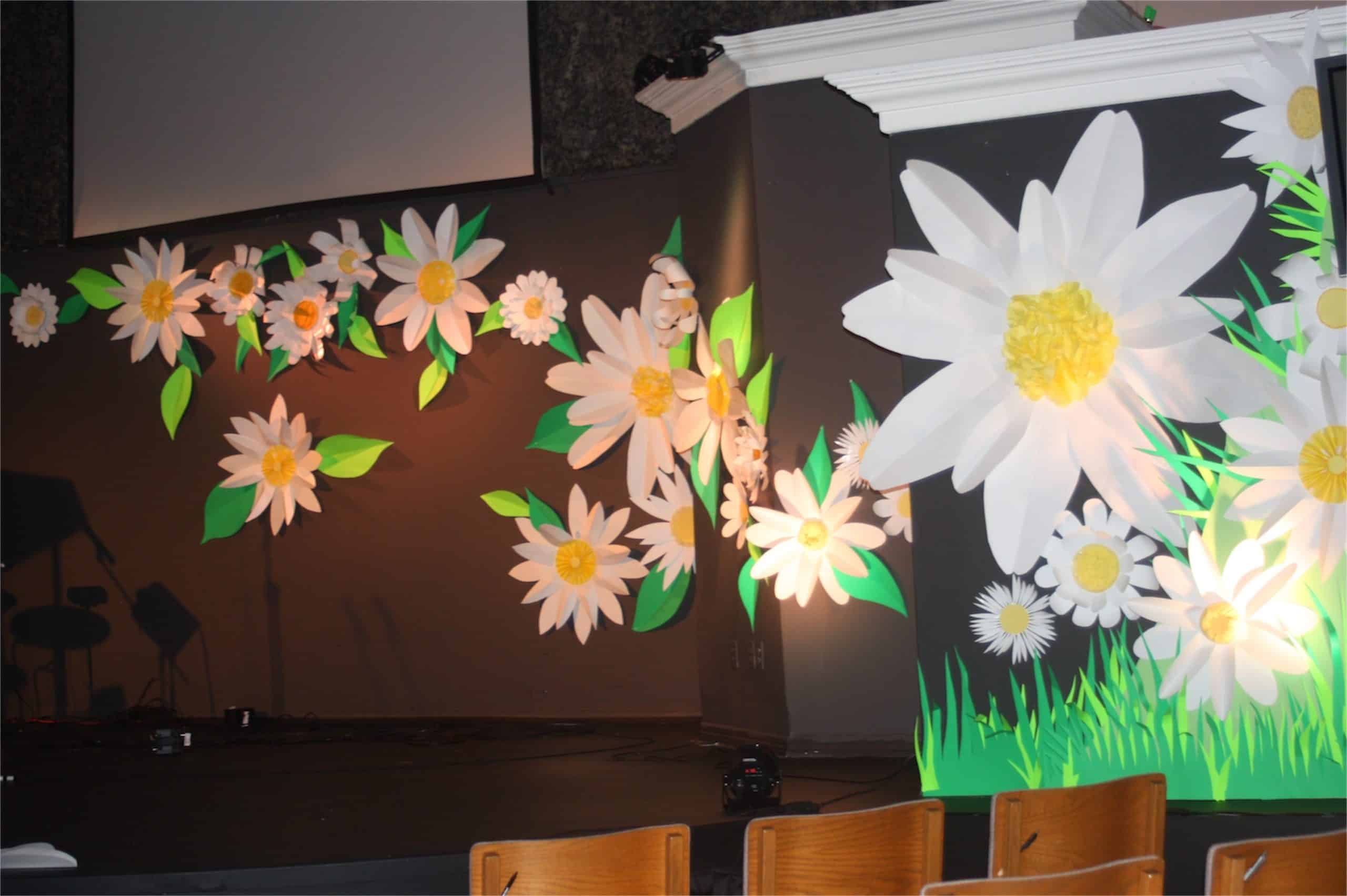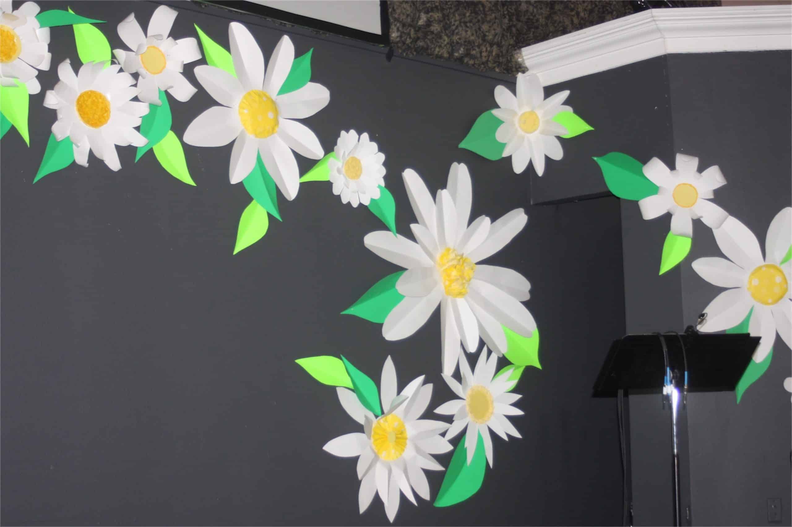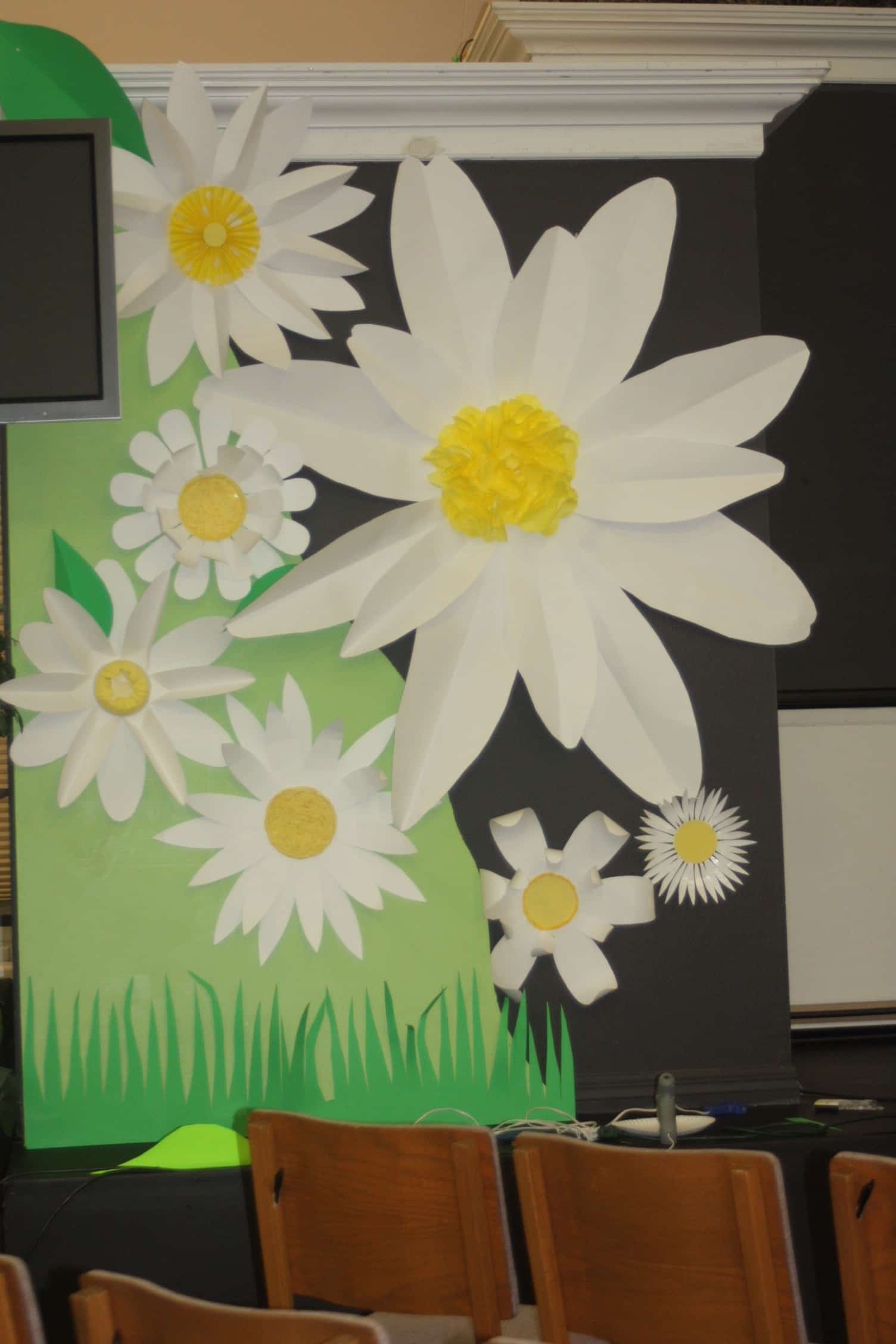 To create this, their design team created multiple daisies in sizes ranging from 5 ft. to 1 ft. across. They used white, green, and fluorescent green poster board from a dollar store. Daisy centers were made from yellow tissue paper, and wrapping paper hot glued to yellow paper plates. Petals and leaves were folded and gently curved to give dimensional effect and catch the LED light. An insulation 8×4 ft. board was cut in half and painted green and mounted to front walls to add paper grass and daisies to give even more dimension.