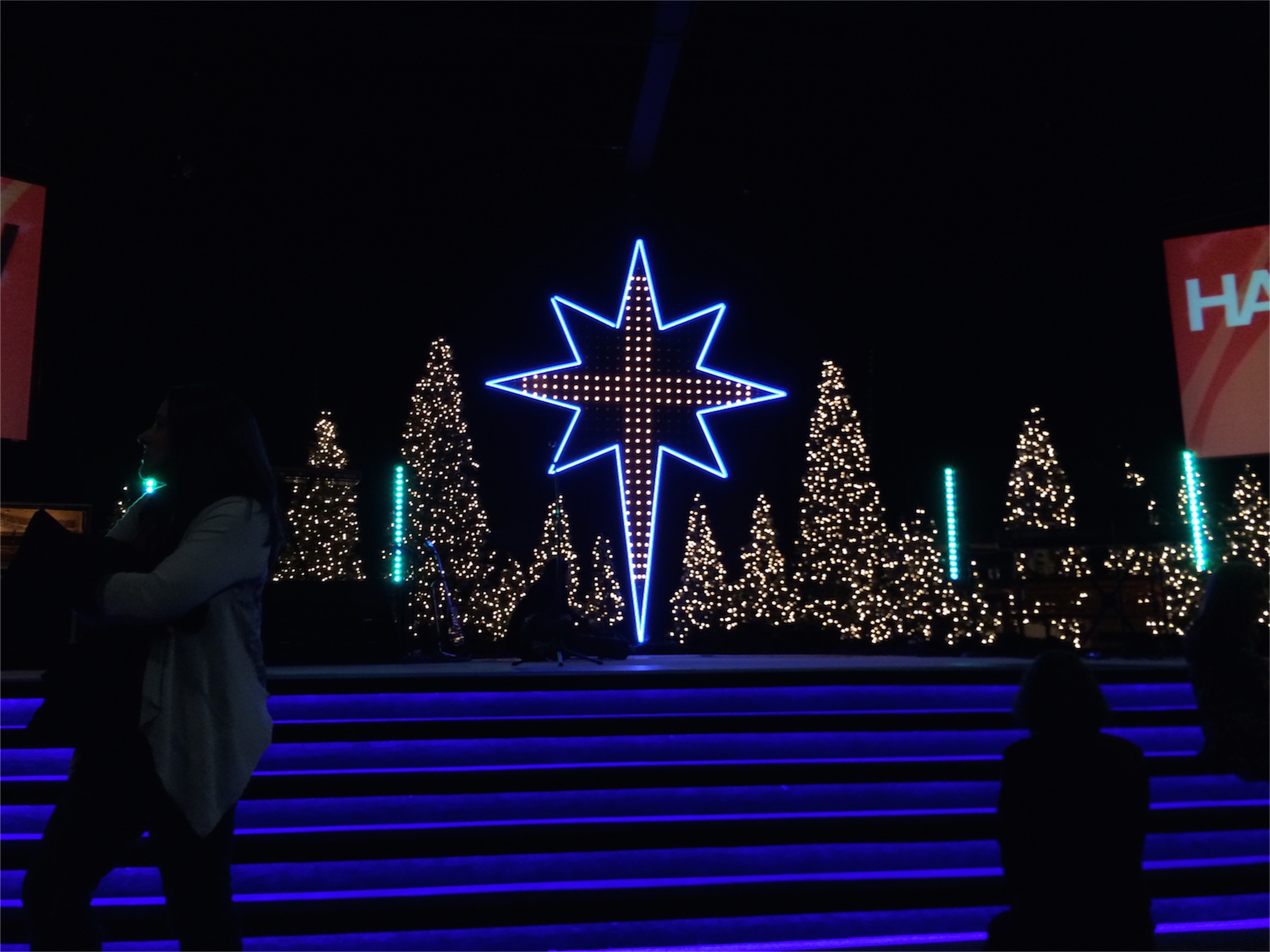 But they needed to come up with a large center piece that could be duplicated on both stages. So they made a star out of plywood and put C-9 christmas light bulbs through the wood. They drilled holes smaller than the widest part of the bulb, with a 7/8″ paddle bit, and screwed it in from the back to hold it in place. They wired the light bulbs so that they could solo the cross on the inside of the star for a few special moments during the show. Then they framed the star with LED strip lights to make it stand out.