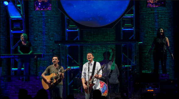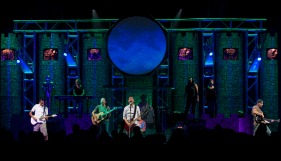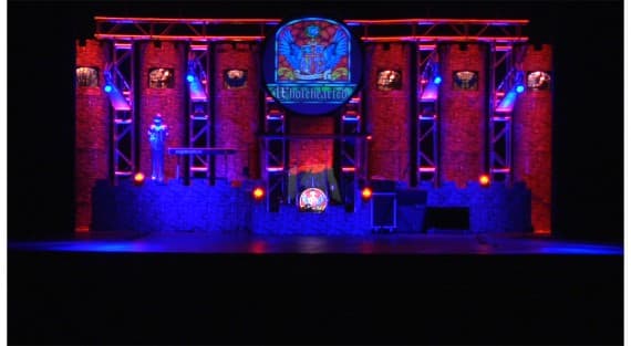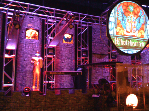 They built the turrets from 1/2 inch styrofoam from Home Depot and curved it around a 2×4 frame to form a half circle. They cut out a window in the top of the turret and used gels to make it look like stained glass.