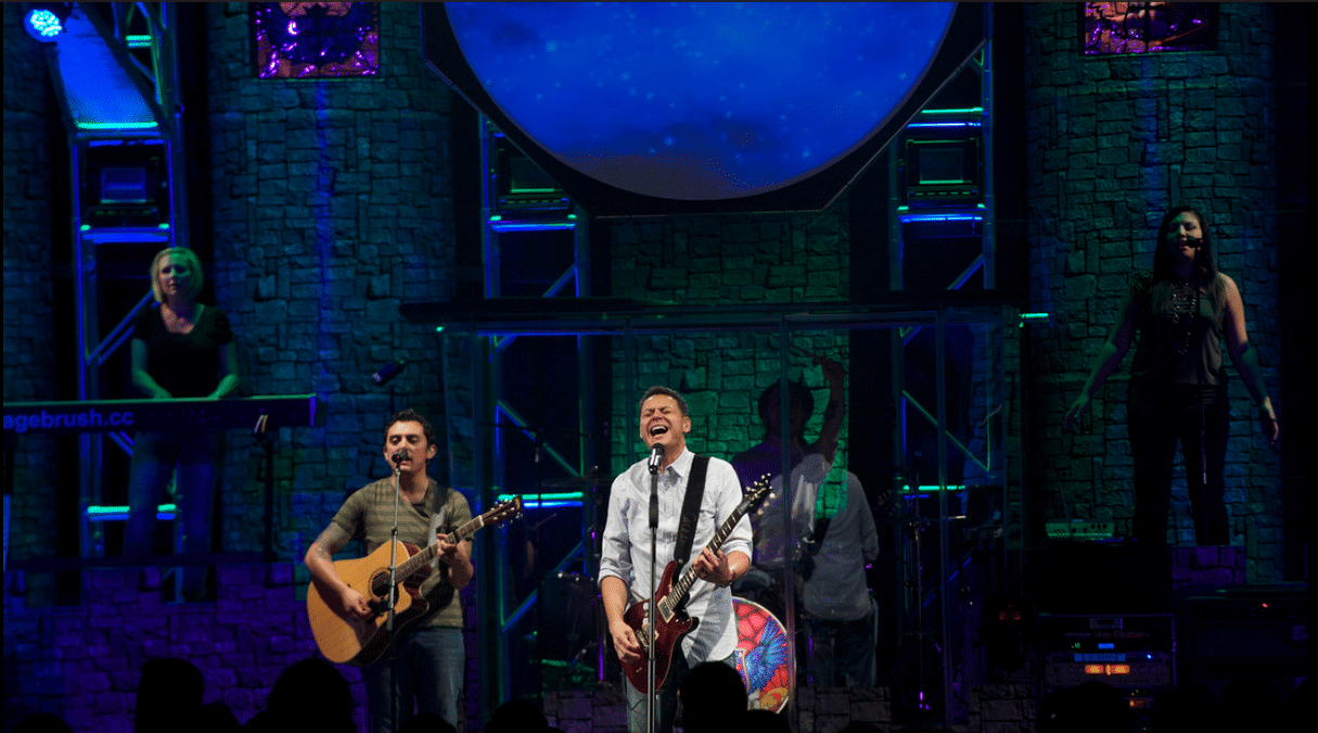 They used their existing PVC truss and suspended the round screen which was projected on by their front projector.
