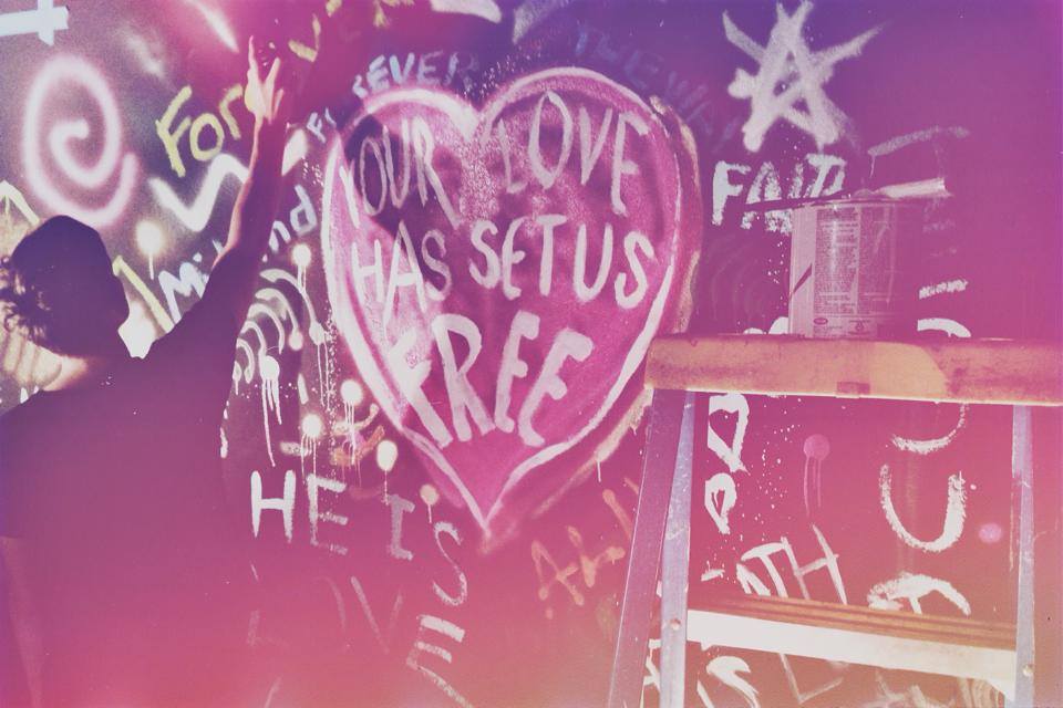 This was a little time consuming but very cost effective. They used a few neon paints and a few blacklight paints but mostly just bright colored spray paints. For the text, they just used paintbrushes and for the graffiti art they used spray paint. They were able to do this in one night (it did take several hours) and spent about $50-70 on materials. This was also a good way to get creative people involved in their ministry. They thought up a few main pieces (the heart, the Brave, the radio tower) and the rest was filling in the gaps with scriptures and song lyrics.