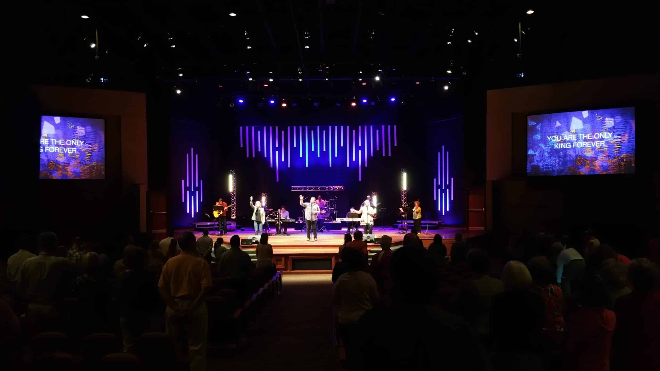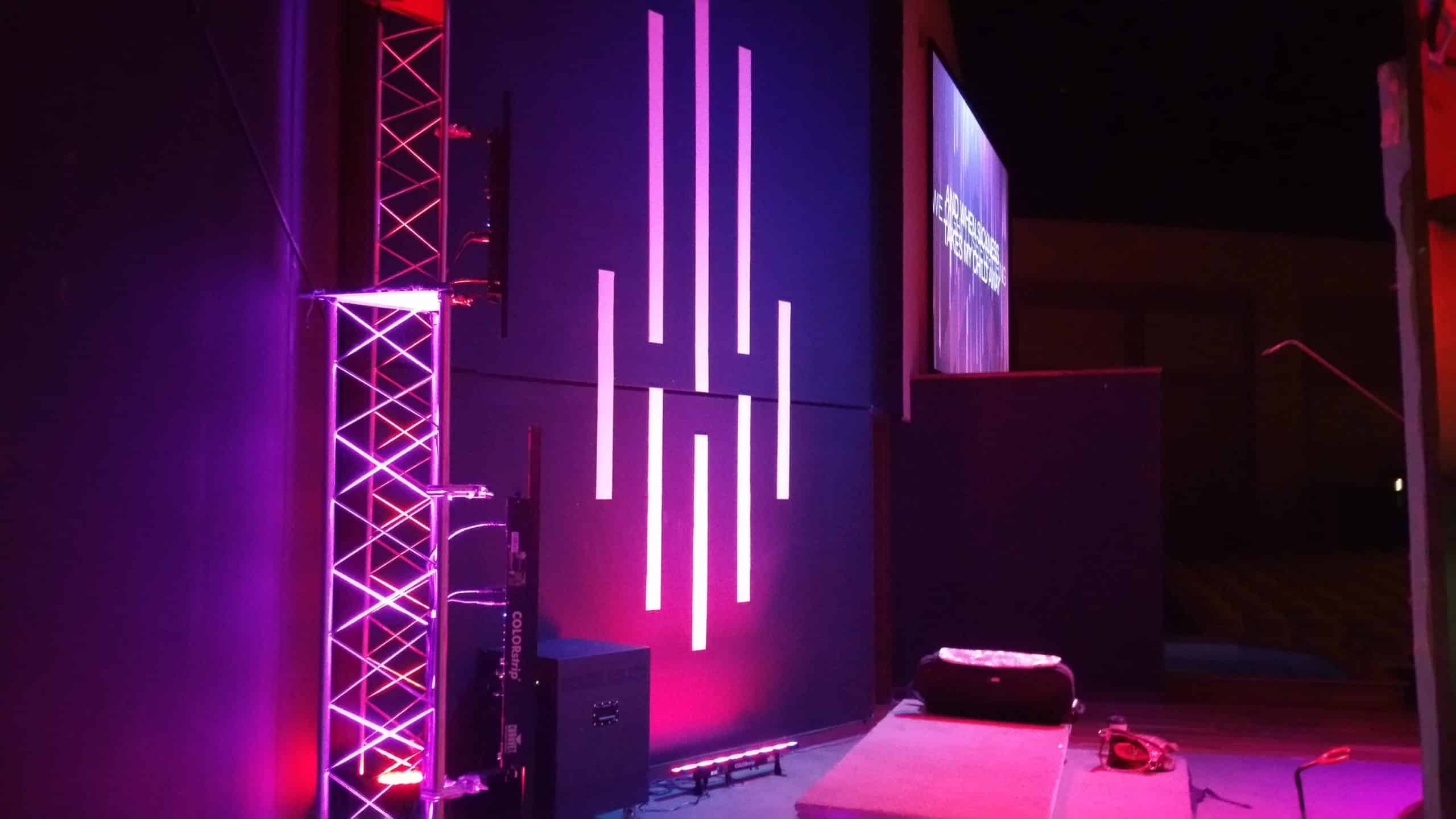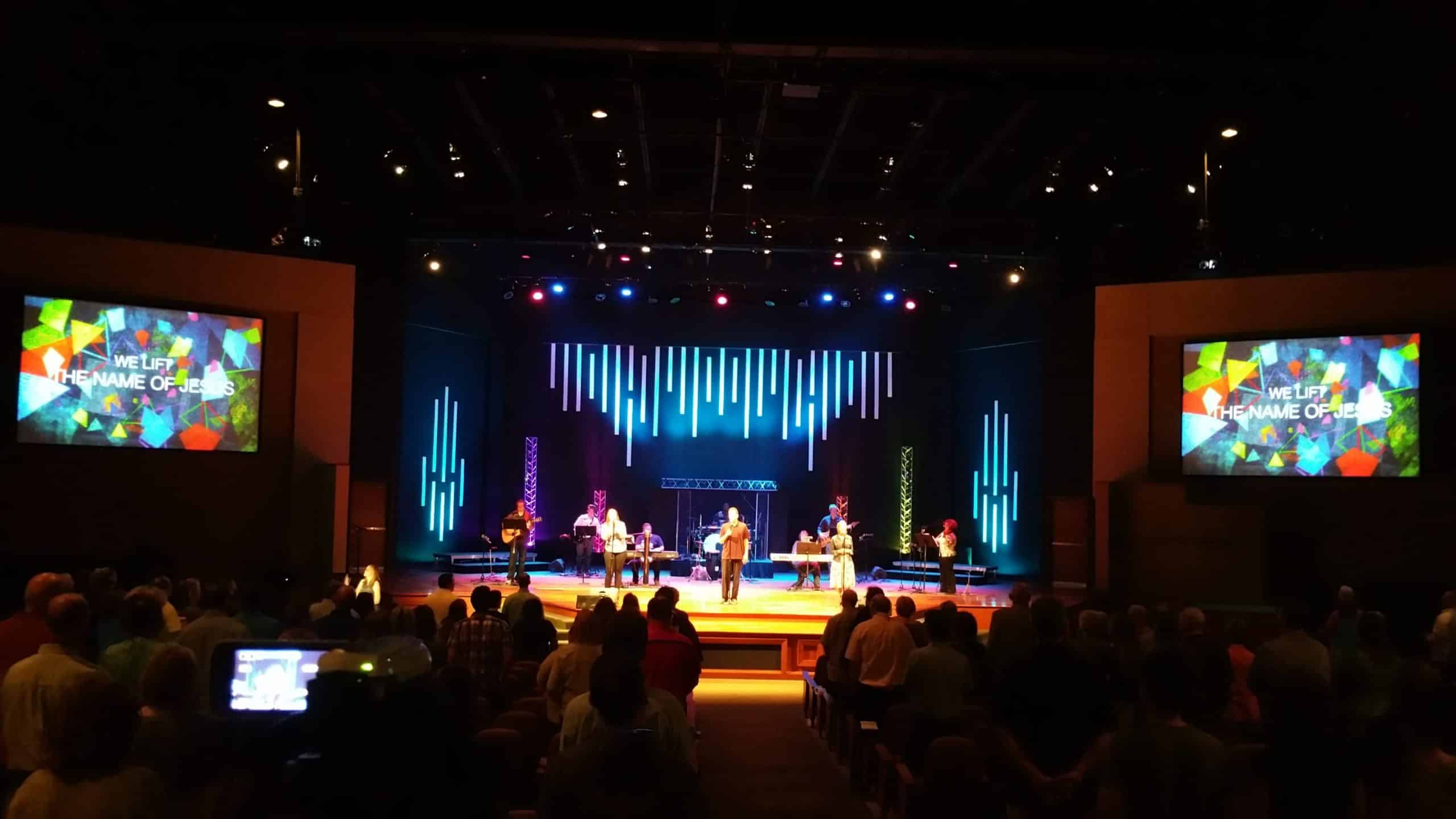 The trusses were from an old youth room stage. These just added modern feel and with Chauvet Colorstrips hanging on them added a fun blinder look. Everything came from past stages. So cost for us was $0.