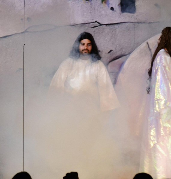 The tree was an old artificial Christmas tree and the trunk was made out of styrofoam. The bark look was made by melting the styrofoam using a soldering iron. The campfire was made with a Bob-led fire lamp and with smoke from fog machine piped through it. The tomb was also made entirely out of styrofoam melted with a soldering iron. A door cut in the set inside the tent allowed Jesus to come out of the tomb during that scene.