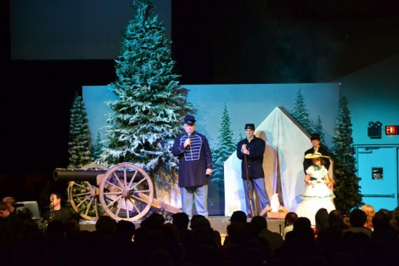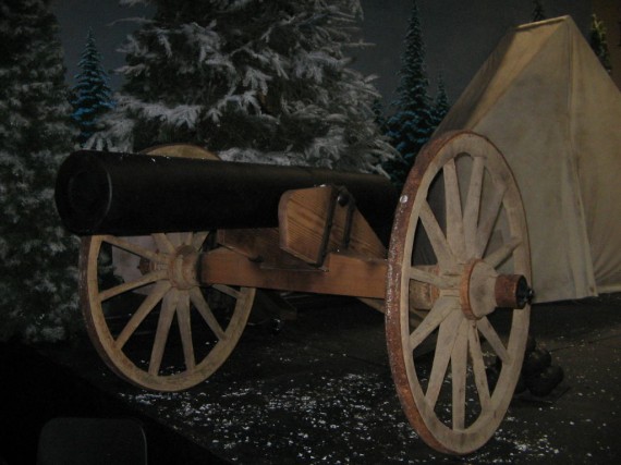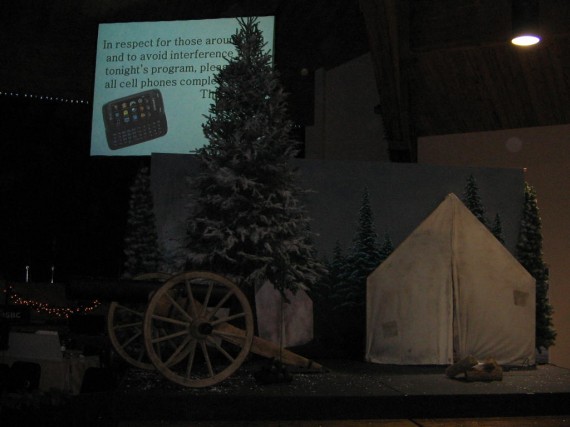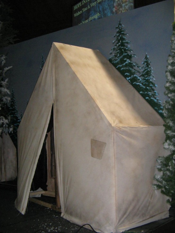 The producer wanted a Civil War scene for a drama about “I Heard the Bells on Christmas Day;” but they also needed a tomb for a later scene. So they built the entire set on casters so it could be rotated for the scene change. The cannon is made out of two old wagon wheels and scrap wood found in someone’s back yard. The Barrel is PVC pipe painted black. The cannon balls were styrofoam balls from Wal-Mart painted black. The tent was made out of a white sheet with patches penciled on.