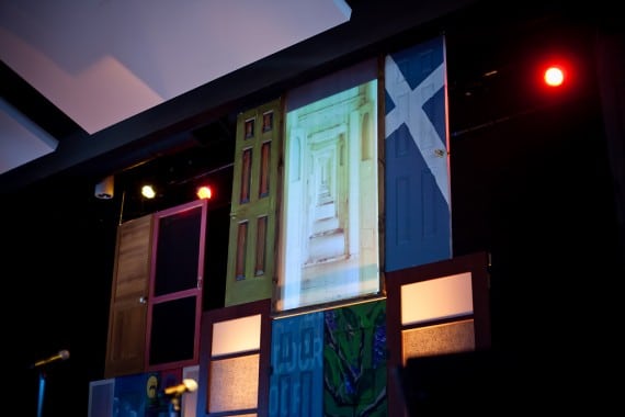 They lit them with Source4’s from the front with a seedy pink color and through the glass with a yellow-gold color.Then they created a ‘digital door’ using Coroplast and a projected image.