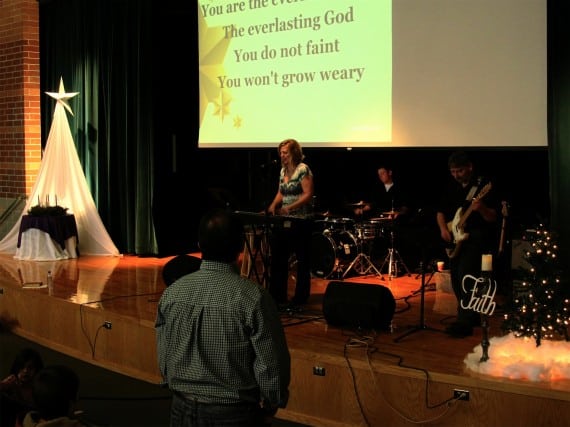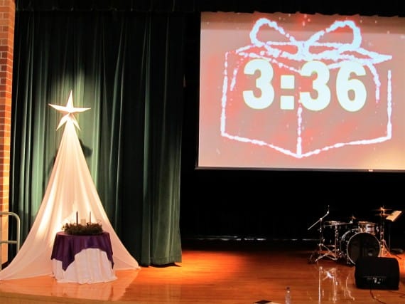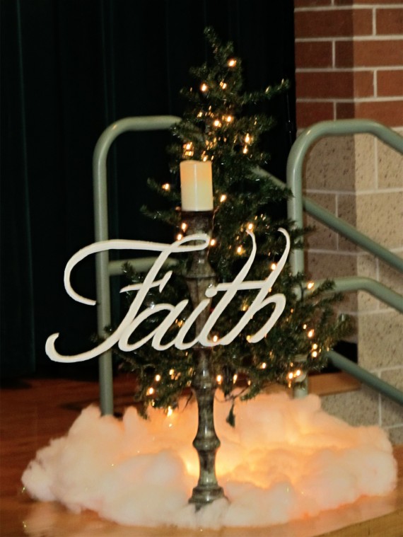 On the right hand side of the stage they put up a little Dollar Tree 4ft tree ($8) and a tall candle stand pillar ($1 garage sale). Then they cut “Faith” out of foam board.