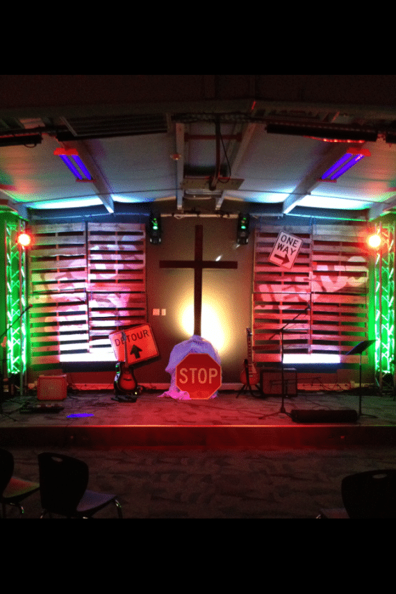 They lit the set with one Mega Bar on each side of the cross at the bottom of the pallets. They have Opti Tri Pars in the trusses and four other mega bars washing the entire stage for an added effect. Behind the cross was simple soft lighting purchased at WalMart for $9.99.