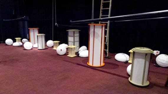 They put the lanterns in their approximate positions on the ground before hanging them. Then they hung the large lanterns from ropes attached to their cyc booms. Then they added different colored gels to light the lanterns.