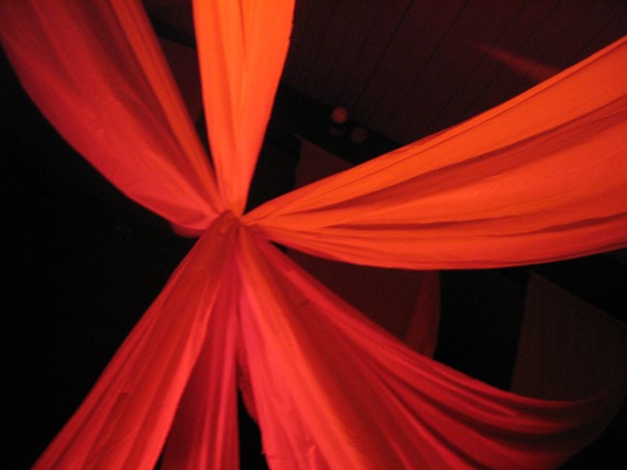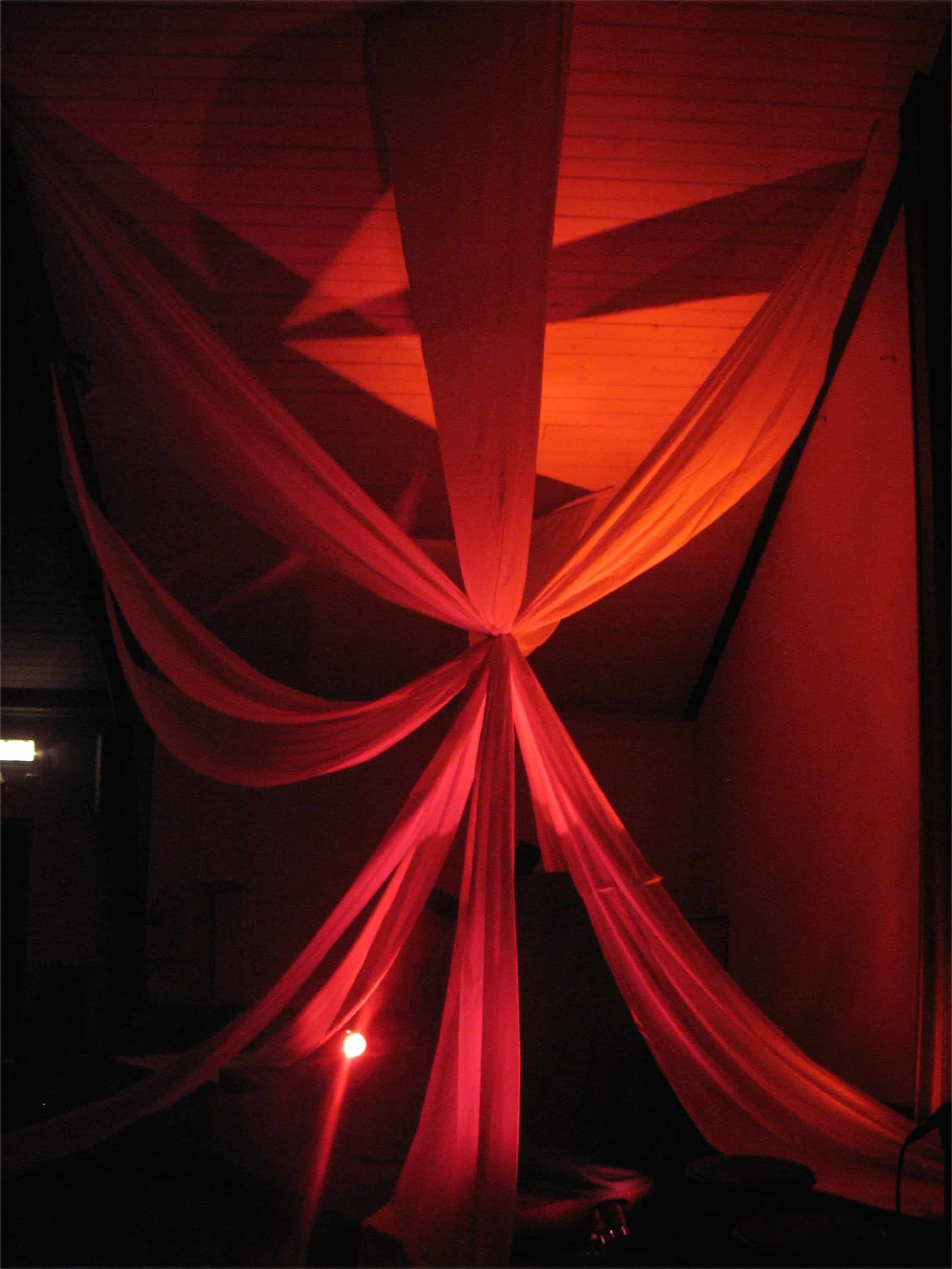They used white and black plain cotton cloth purchased from JoAnn’s for the stage design. They sewed pockets into the top of the cotton to fit 1/2″ pvc piping that was mounted to the ceiling. The black fabric was draped over a circular frame made from flexible PVC. In the middle, Tyler bunched the cotton together and tied a fishing line around it. He then tied it off to an anchor point on the wall behind.