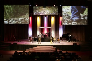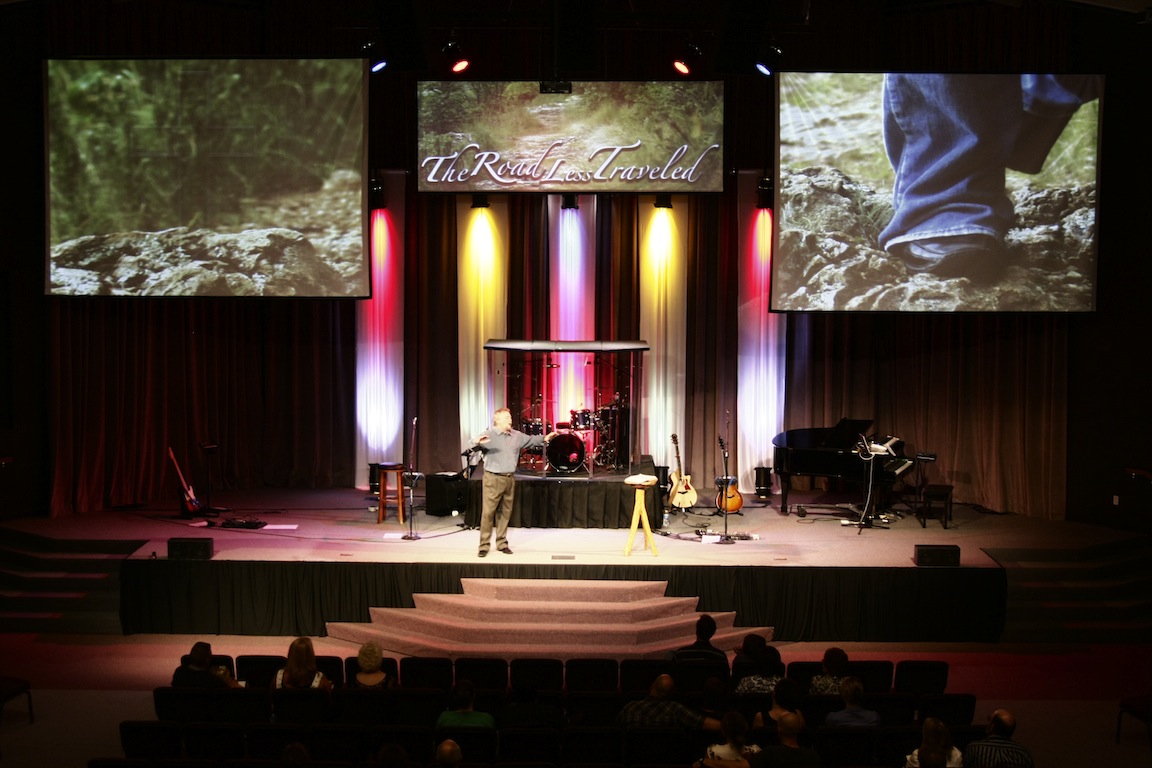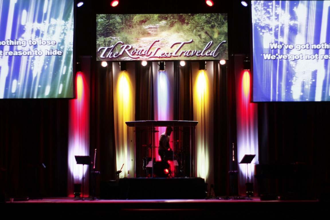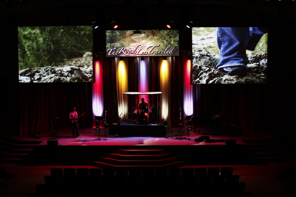 Keith Bell from Carterville Christian Church sent us this bit of towering spandex from their series “The Road Less Traveled”. He purchased 24 yards of spandex from Spandex World (not to be confused with gyms from the 80’s)  for $7/yd. They then lit it with 10 Par 64s…5 on the bottom 5 on top.