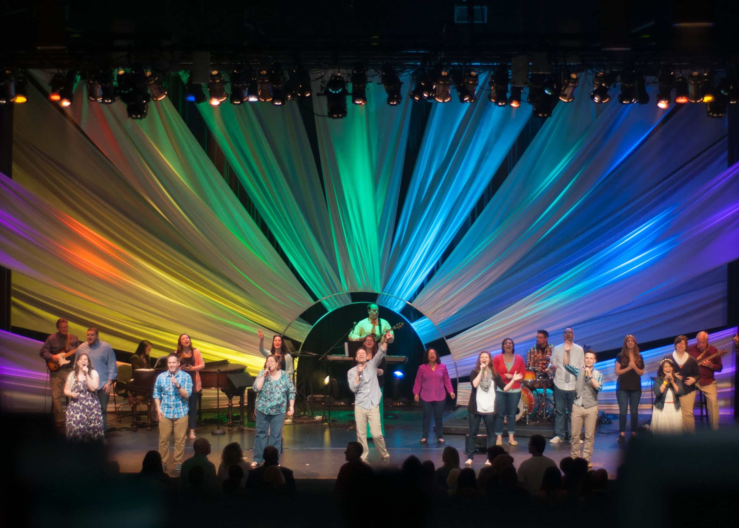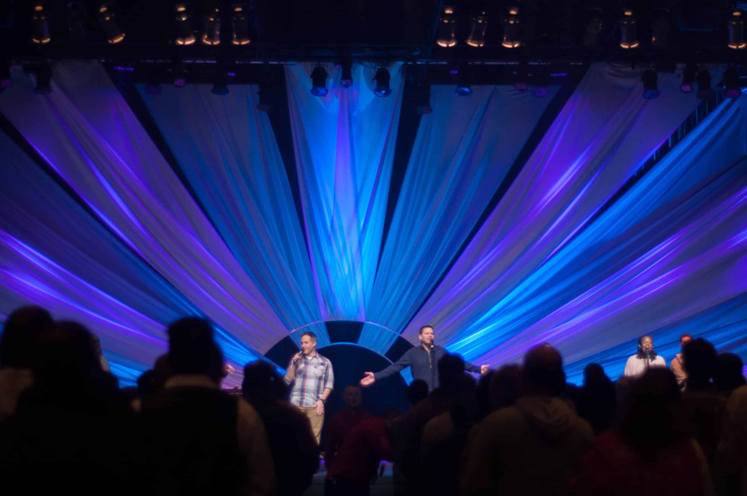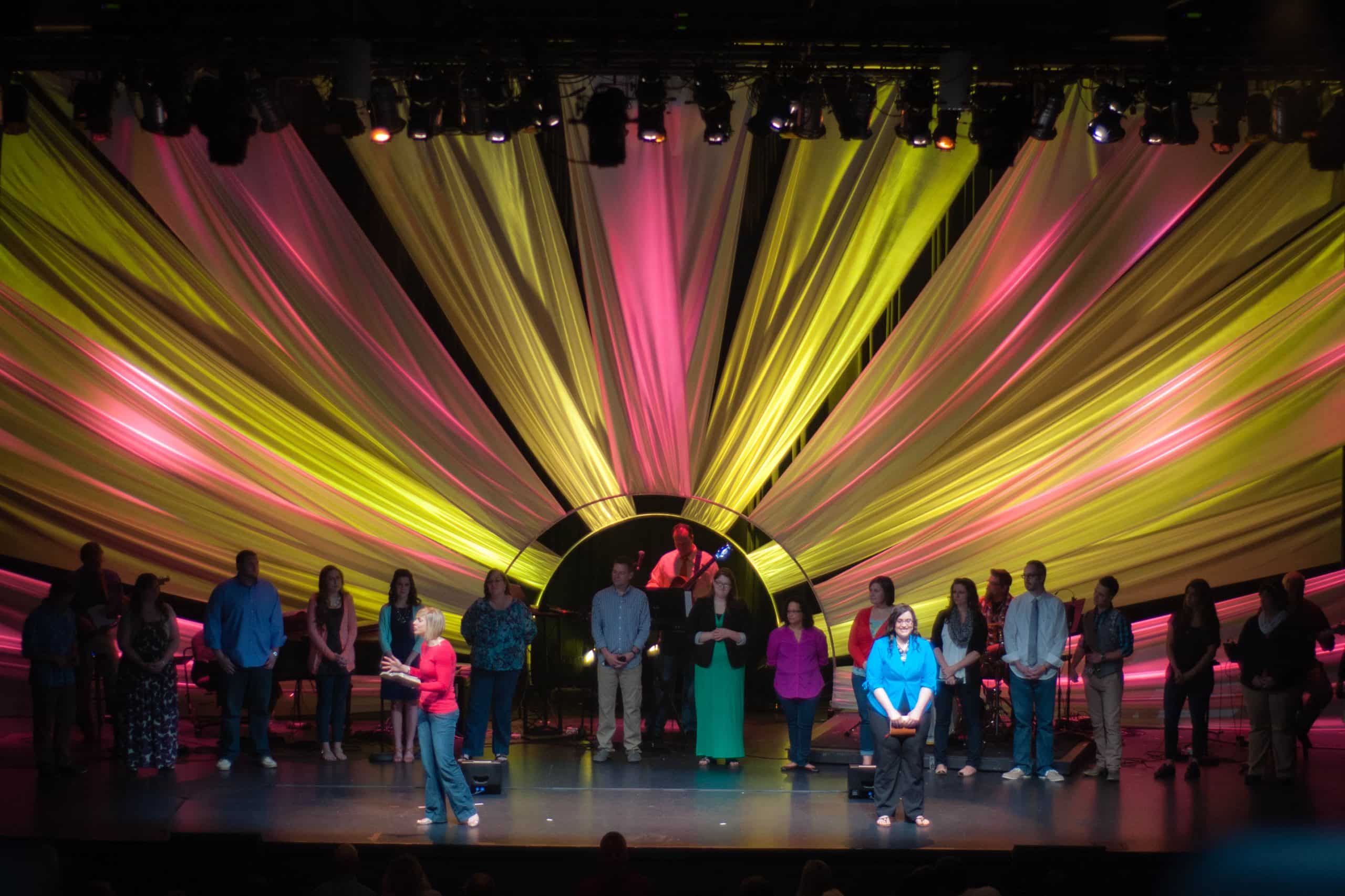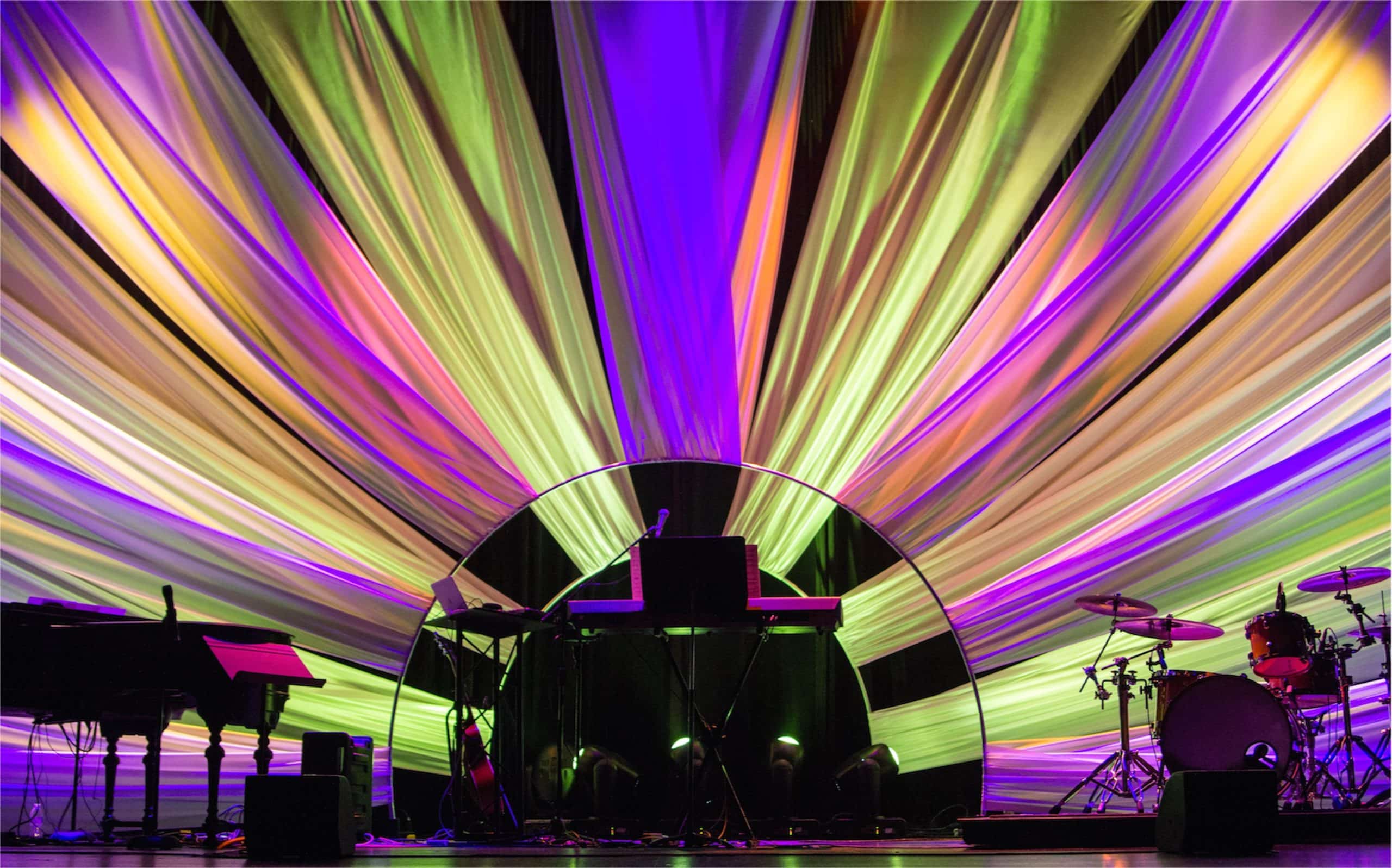 The precursor to this design was the Slab Wood design. It had hard lines, jagged edges, and worst of all…icky splinters. As the design team got together, they all agreed it was time to get in touch with their softer sides. Rather than turning to Sears, or the killer fabric of our lives, they turned to the glorious king of sheen: Satin. The nice thing about working with soft goods is that they can fill a lot of space quickly. The idea was to involve some sort of arch in the middle of the stage from which they could pull fabric and symmetrically stretch it out like rays of sunshine. They also wanted to create some depth by making two layers.