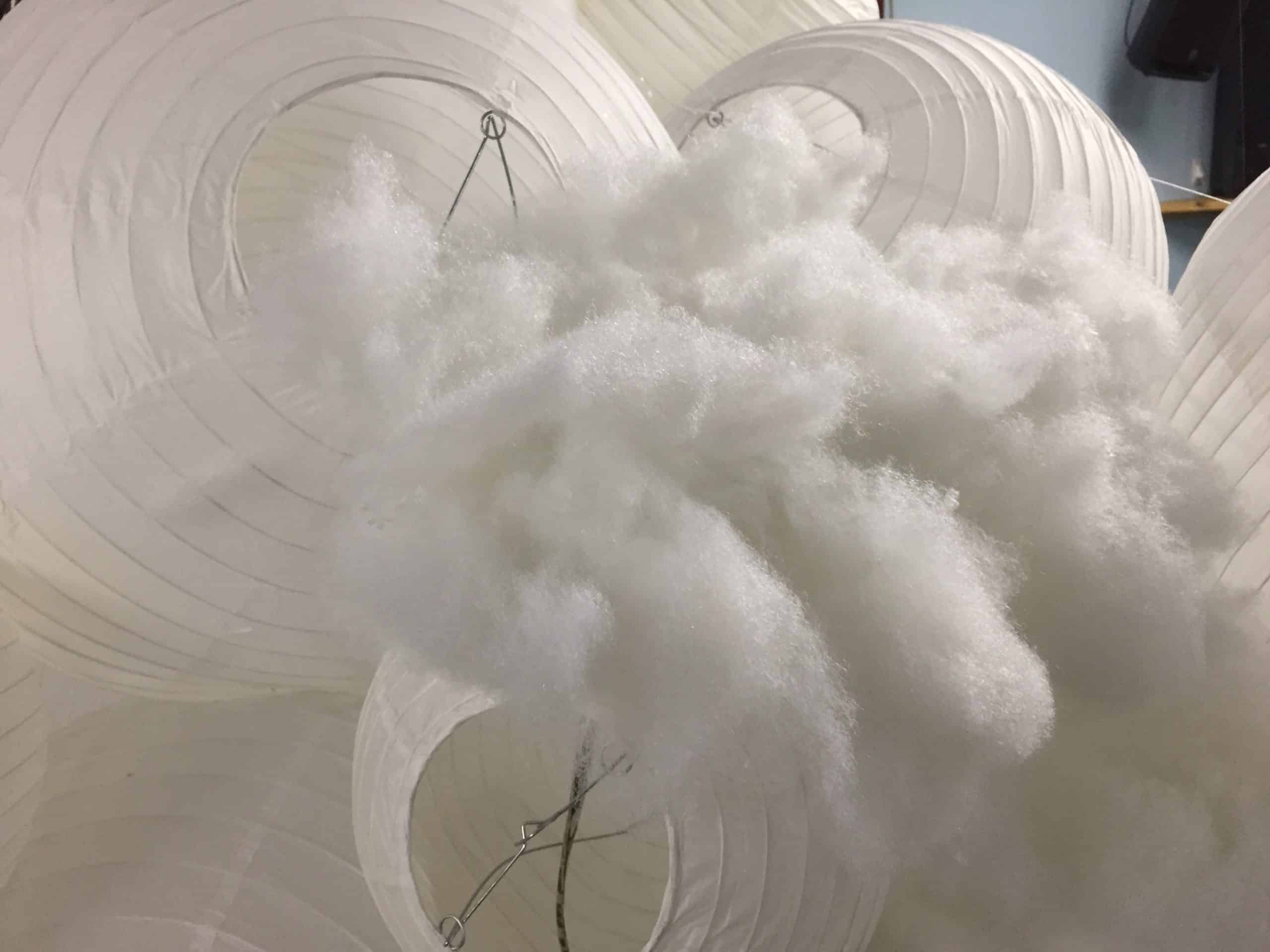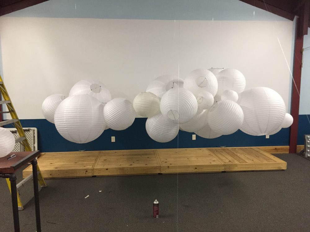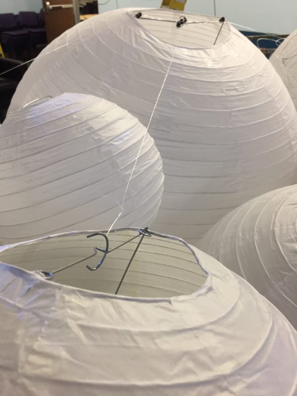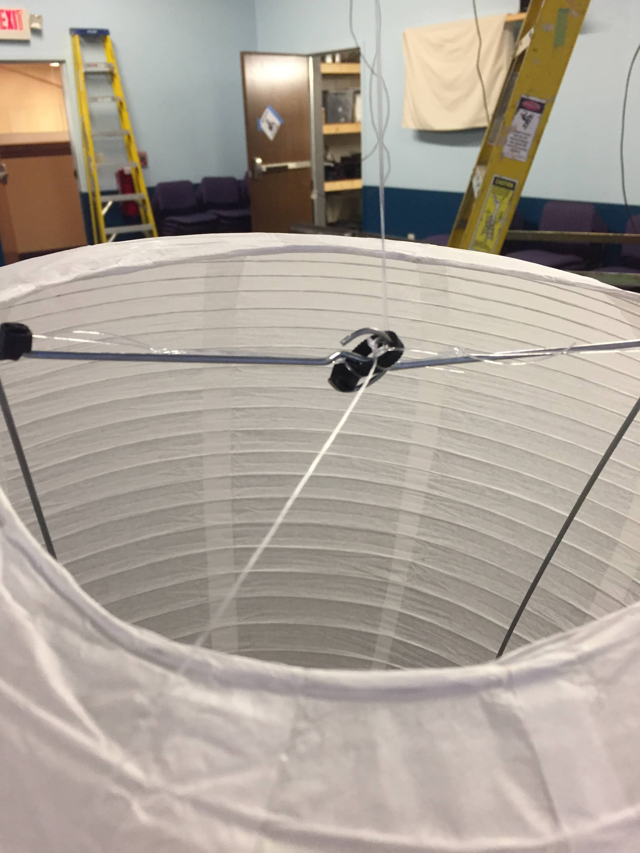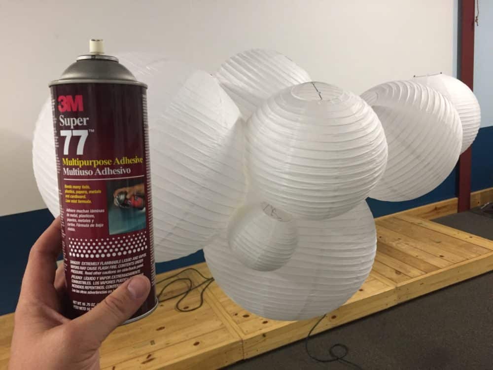 1. We hung the 30″ lanterns as the main anchors, zip tying their structures for increased integrity. Then we hung the 20″ and 12″ lanterns from the 30″ lanterns and spray glued them in place. (Tip: spray both surfaces, then wait about minute for the spray glue to slightly dry. Then press together from the inside. The bond will be stronger if you wait for it to dry just a little.) Make sure it’s asymmetrical to appear more cloud-like.