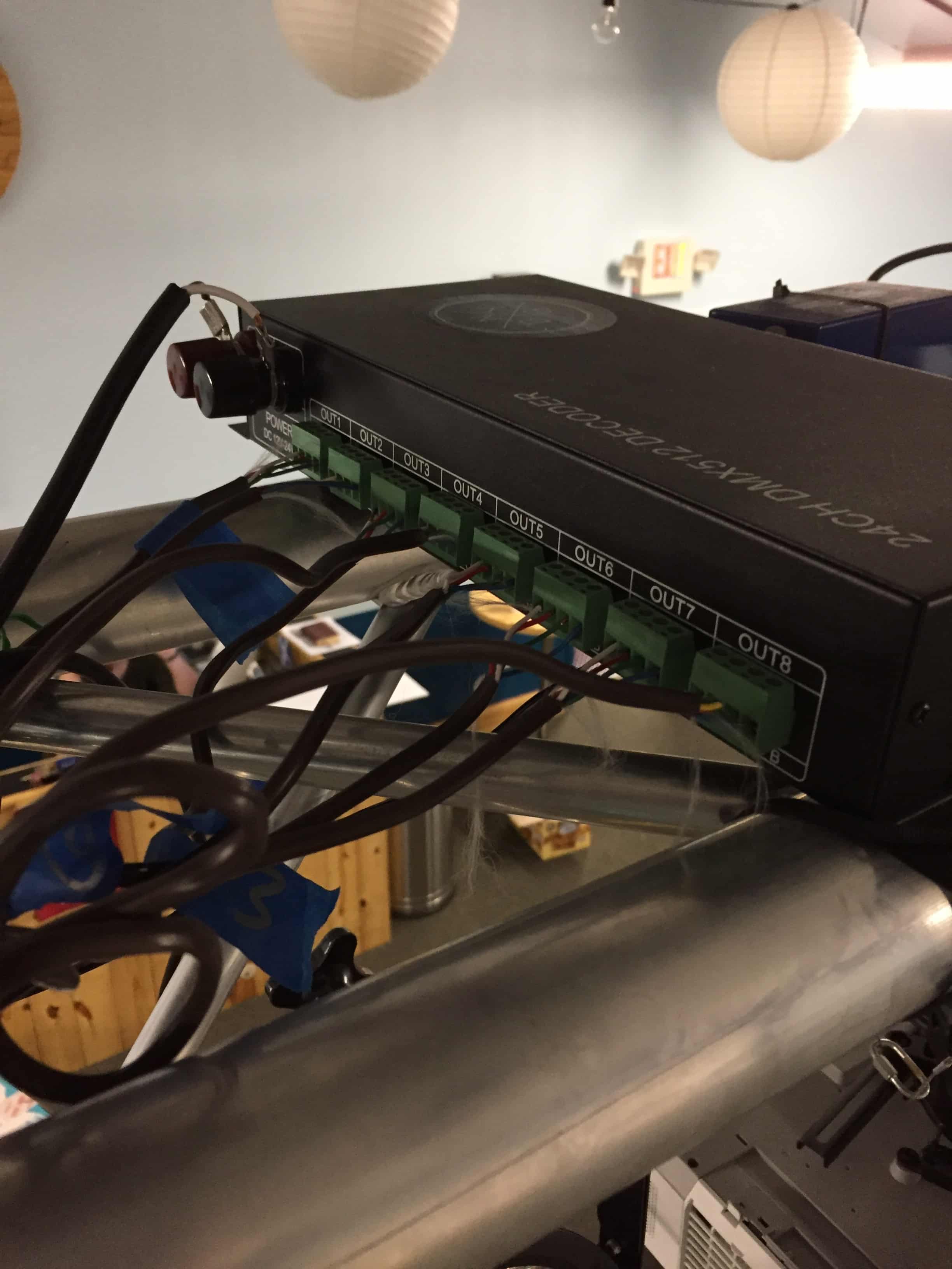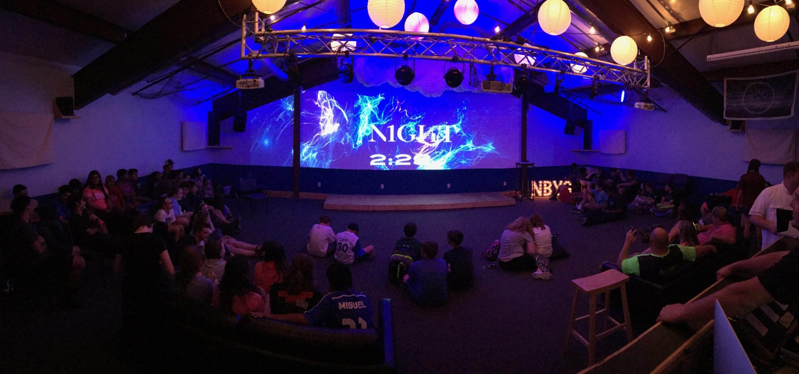 LED strips are controlled by MadMapper software via an Enttec ODE blue box. Triple wide projection is via ProPresenter and Triple Head 2 Go from an iMac. Permanently installed in the room are 8 Chauvet SLIMpar 64s washes.