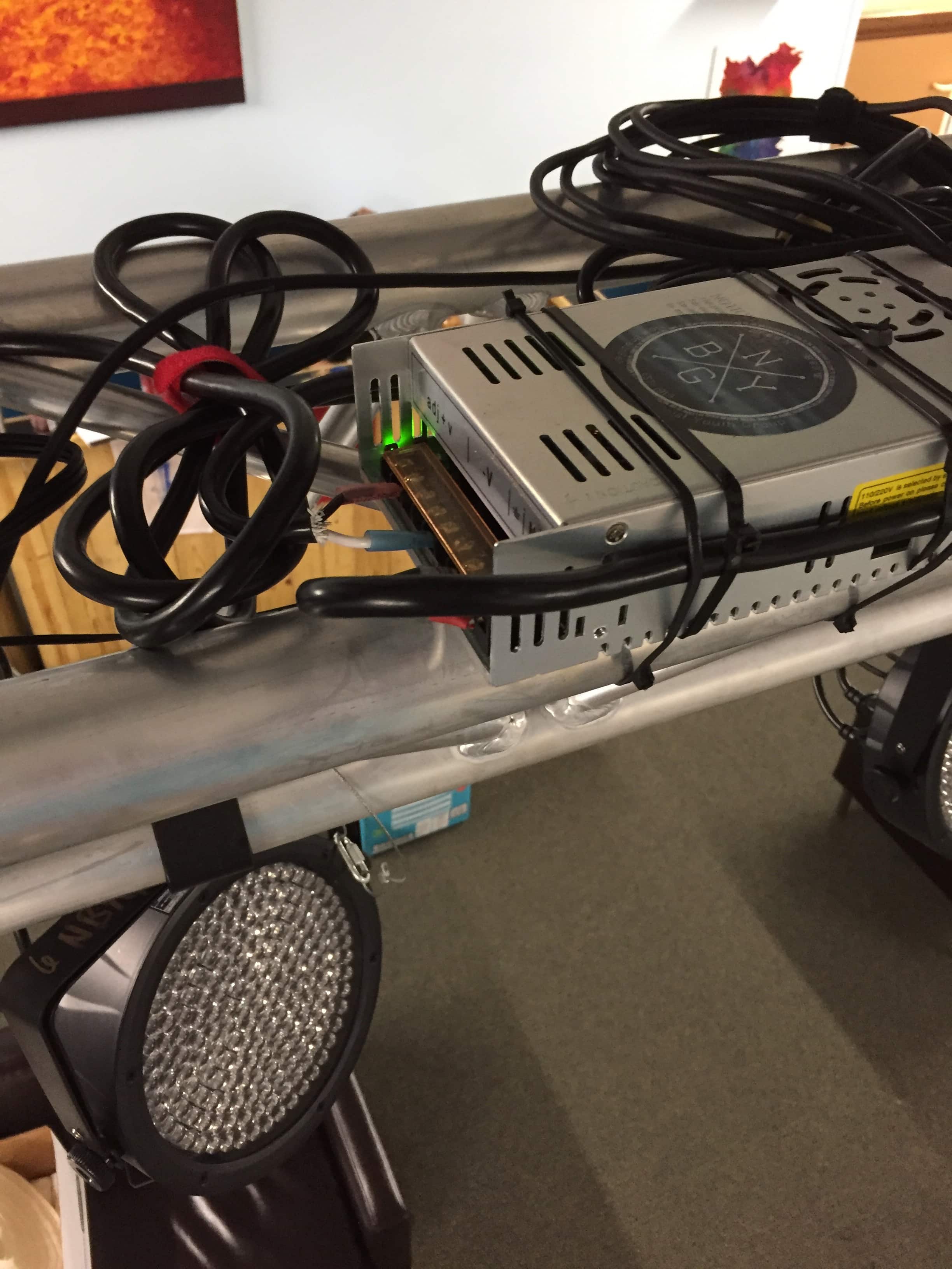 4. Three people hoisted the six anchor lines, which were then tied off. We connected the LED strips to their respective leads and fired it up.