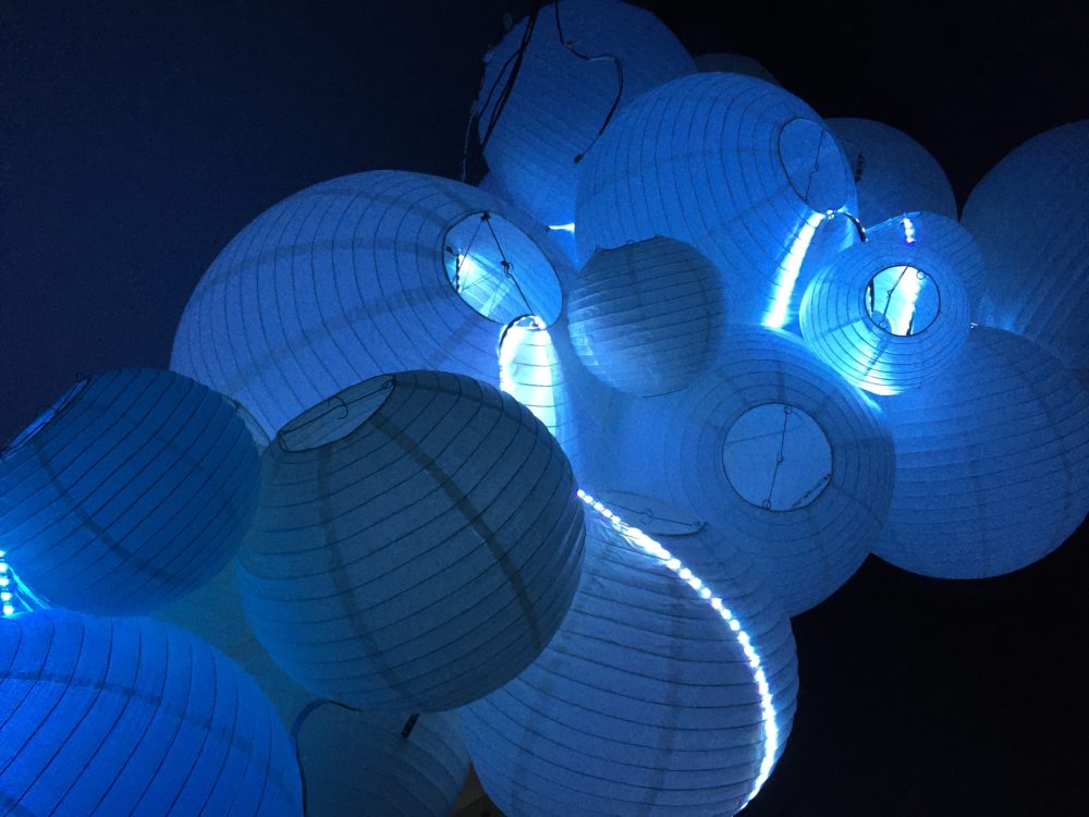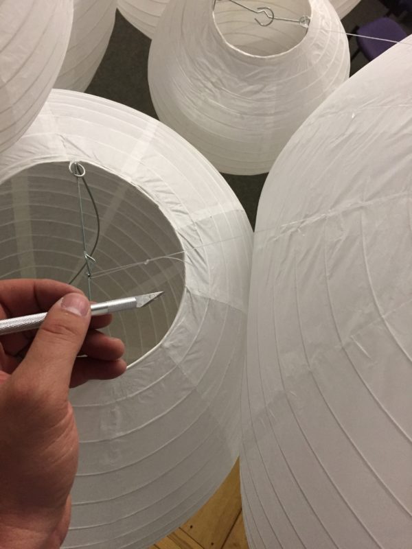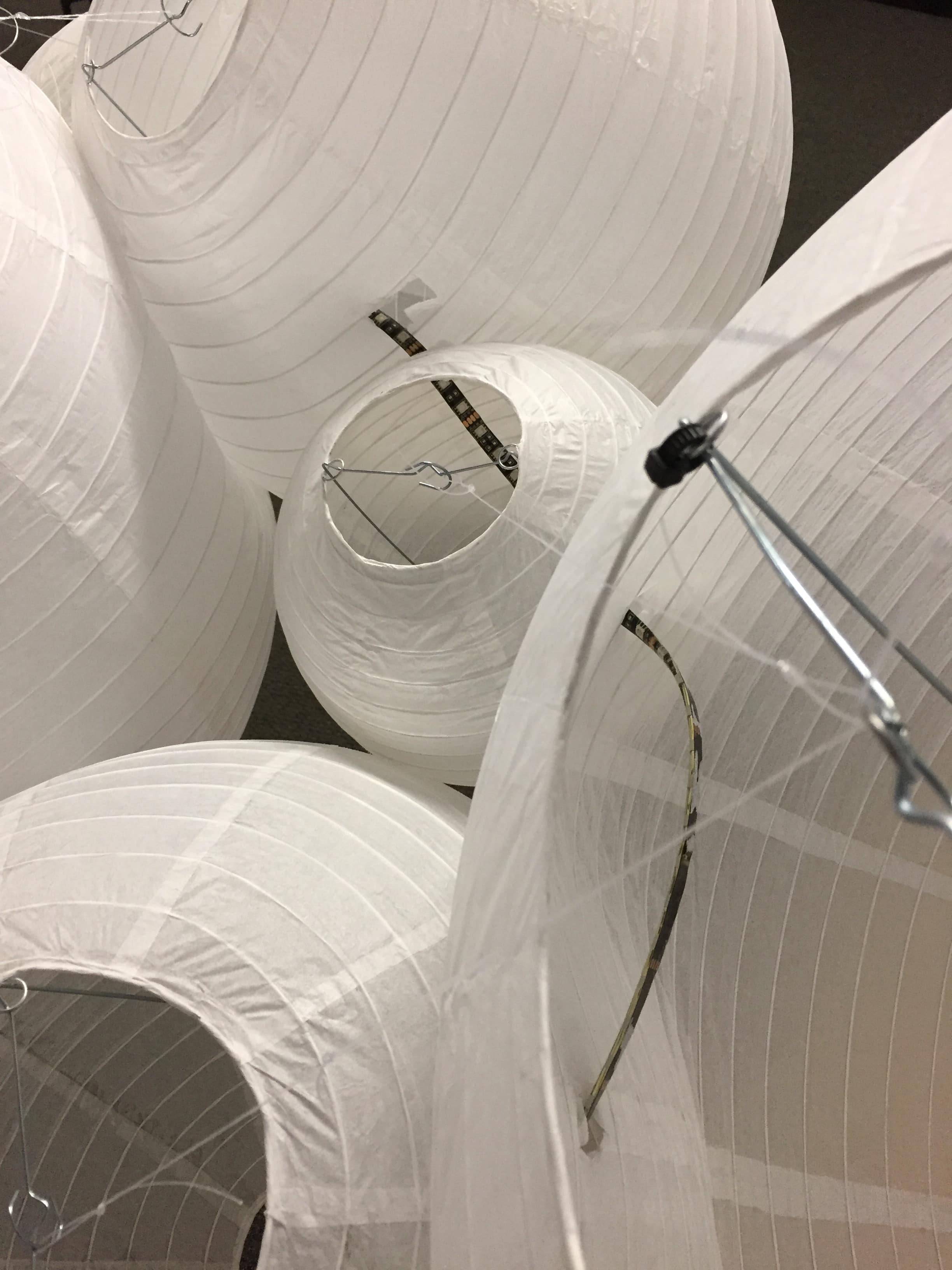 2. Once the structure was complete, we threaded the LED tape inside and through the structure. We didn’t worry too much about tearing holes–those would be covered up later anyway, and the lanterns are surprisingly tough.