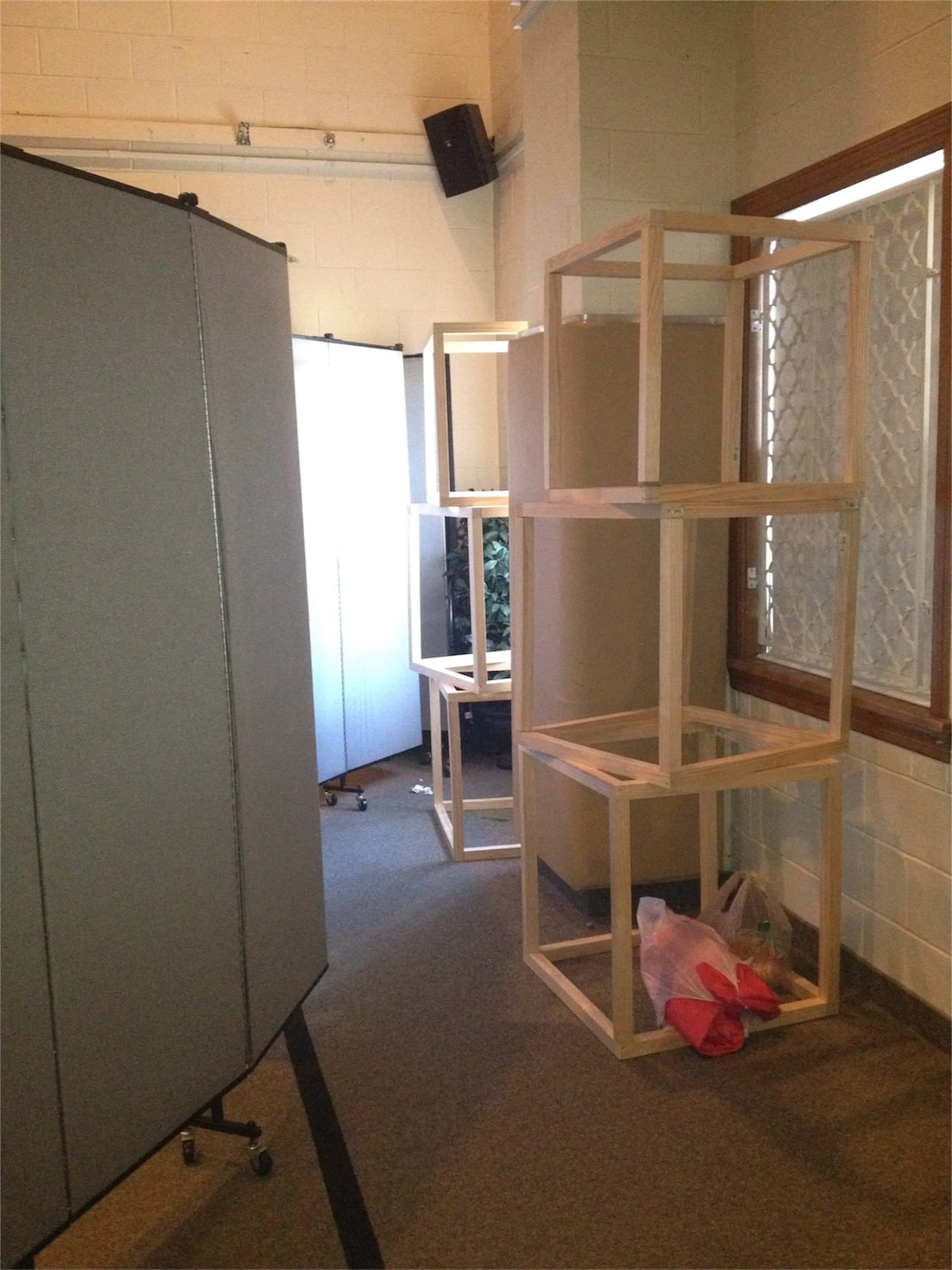 For the hanging backdrop they cut out shapes from thick poster board and used fishing line to hang them. The set cost under $350 in total.