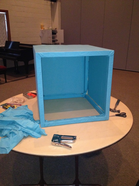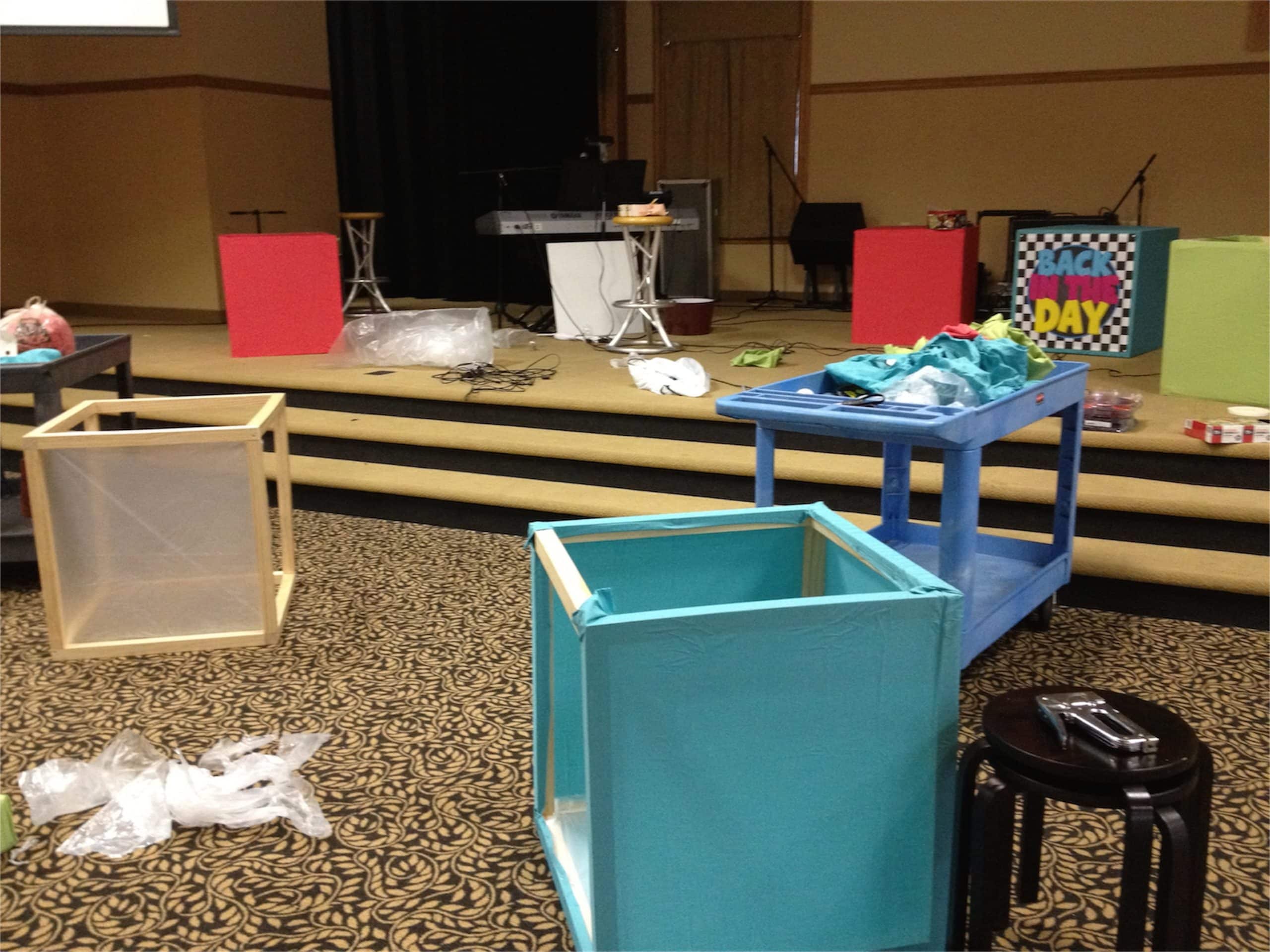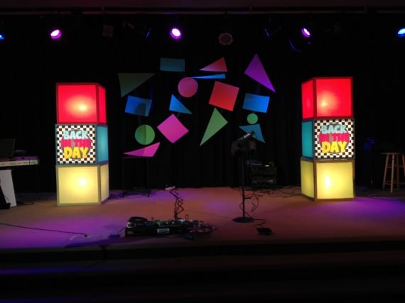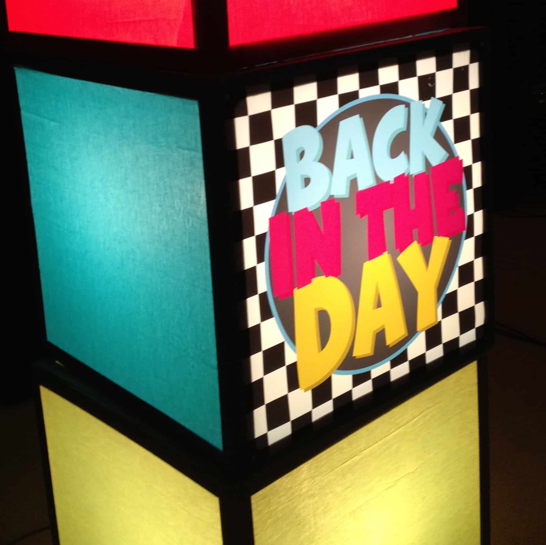 Then they attached plastic to the inside of the box which helped diffuse the light inside. They also used bright colored bedding fabric to wrap outside the box – leaving one side unwrapped for the “back in the day” graphic. To light the boxes, they used low wattage light bulbs and hung one inside each box. They were on dimmers.