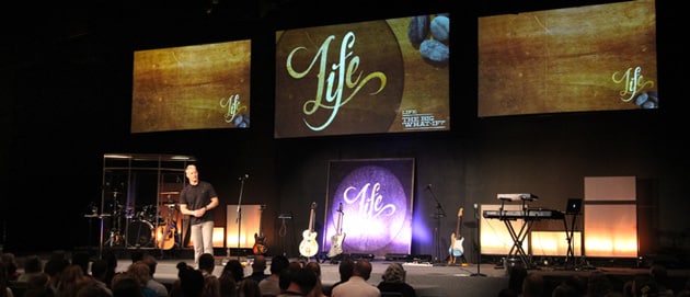 As a stage feature, they developed a 7 x 7 stained particle board structure with vinyl stickers on it so that it would be rich in texture and make the graphics pop out. During the series, they passed out rocks to symbolize the baggage that we all carry around. The final week of the series they gave everyone a sharpie and invited to them to label their burden (rock) and leave it at the alter of the church during a prayer time. They kept the board up for the series without any rocks, and after the final week of the series, all of the LifePoint staff (from both campuses) was invited to build the rock structure with a bunch of gorilla glue.