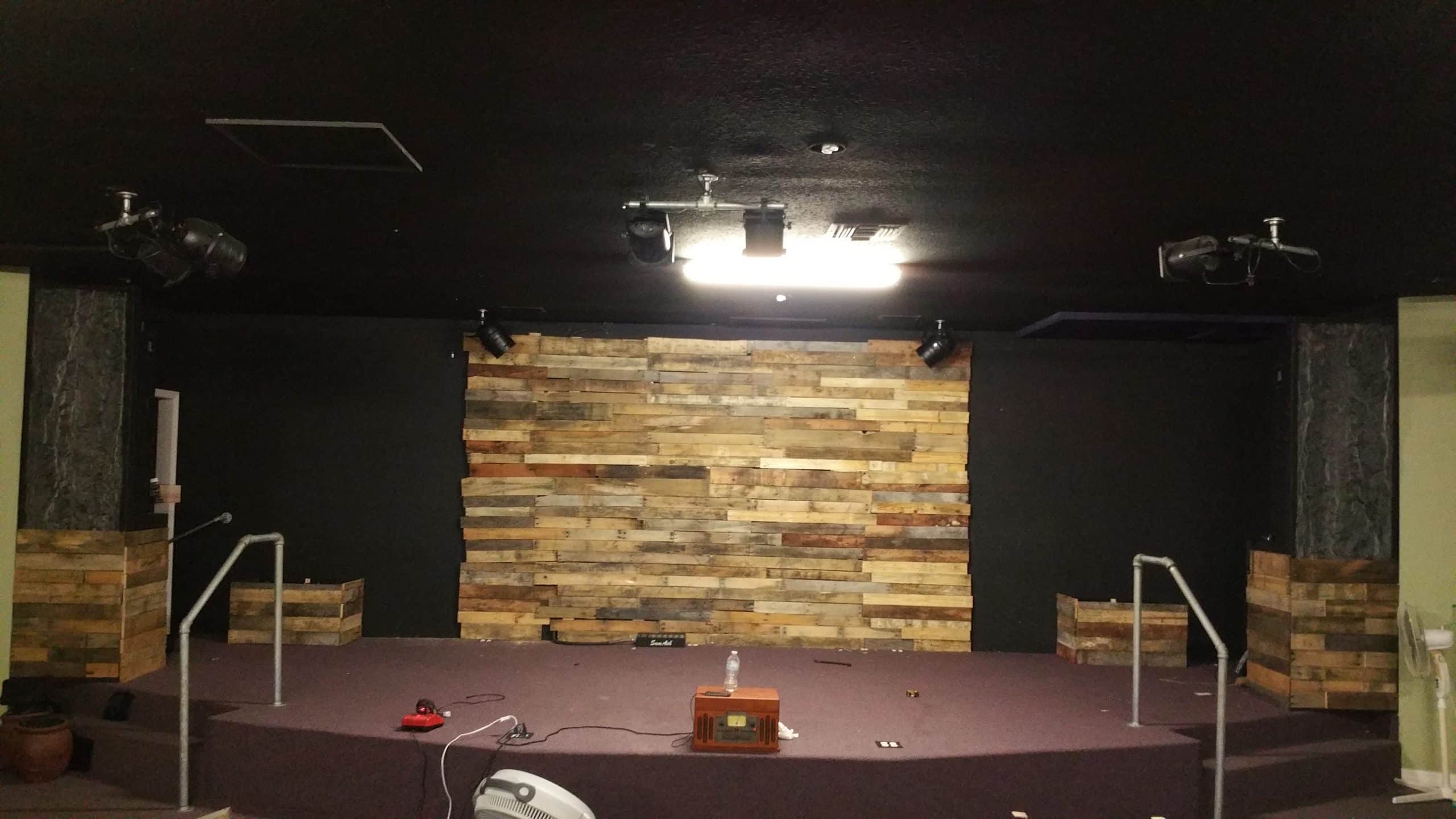 Their speaker left and right were elevated on a pair of industrial heavy duty shipping crates. They created a frame for the front and used the pallet wood on the lower part about 30in high to match the rear wall and the top portion was window screen ( 36″ x 48″) 2 rolls, to create a rocky illusion. They used five 2x4s plus 2 rolls of silver screen that cost them a total of $25 for both.