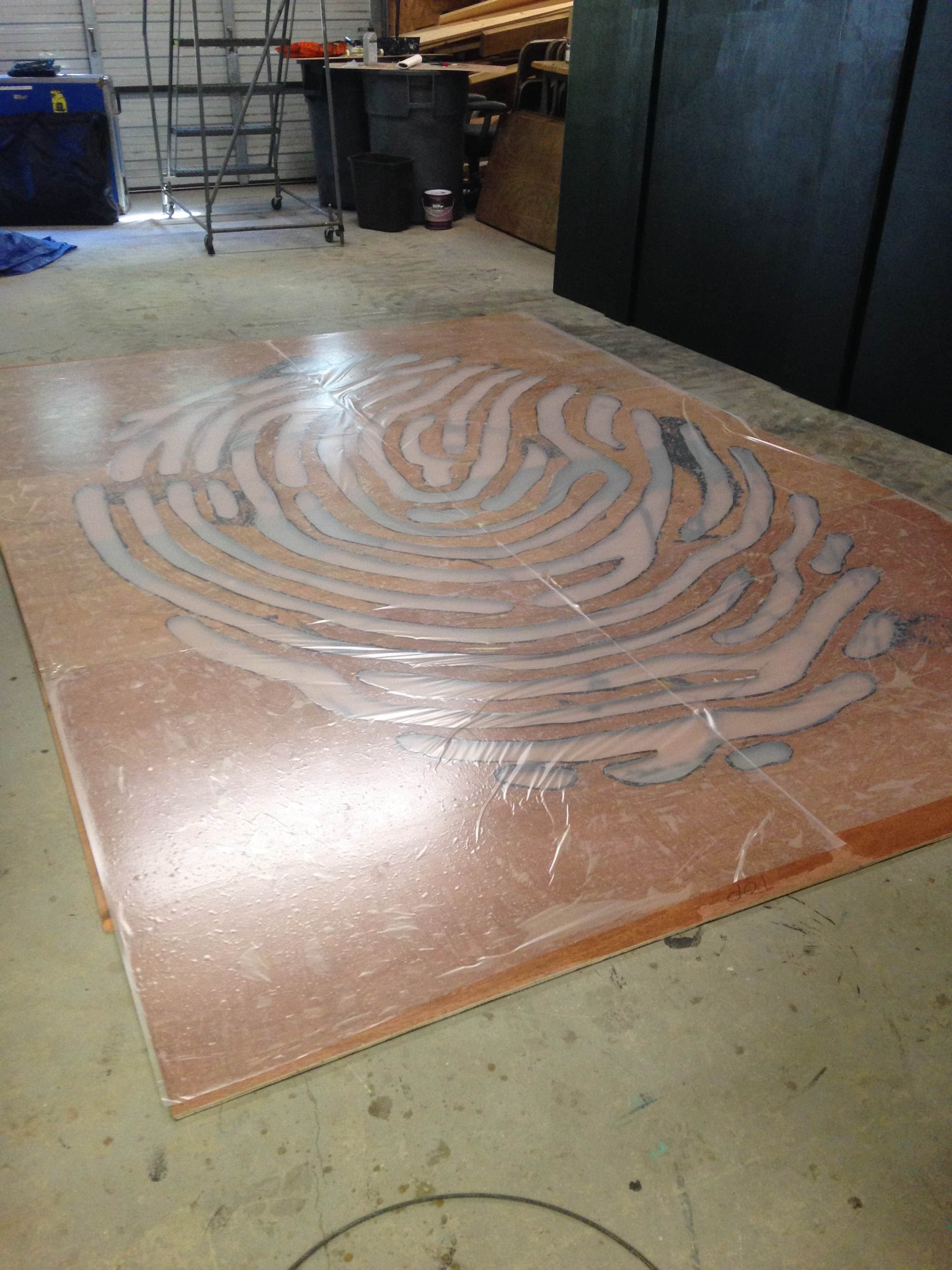 We bought a roll of diffusion gel and glued it to the back of the fingerprint. We tried this method before on a sign and the glued gel did not hold well, so we tested a few different adhesives and found that Vinyl Flooring adhesive is the best for gluing gel to wood…