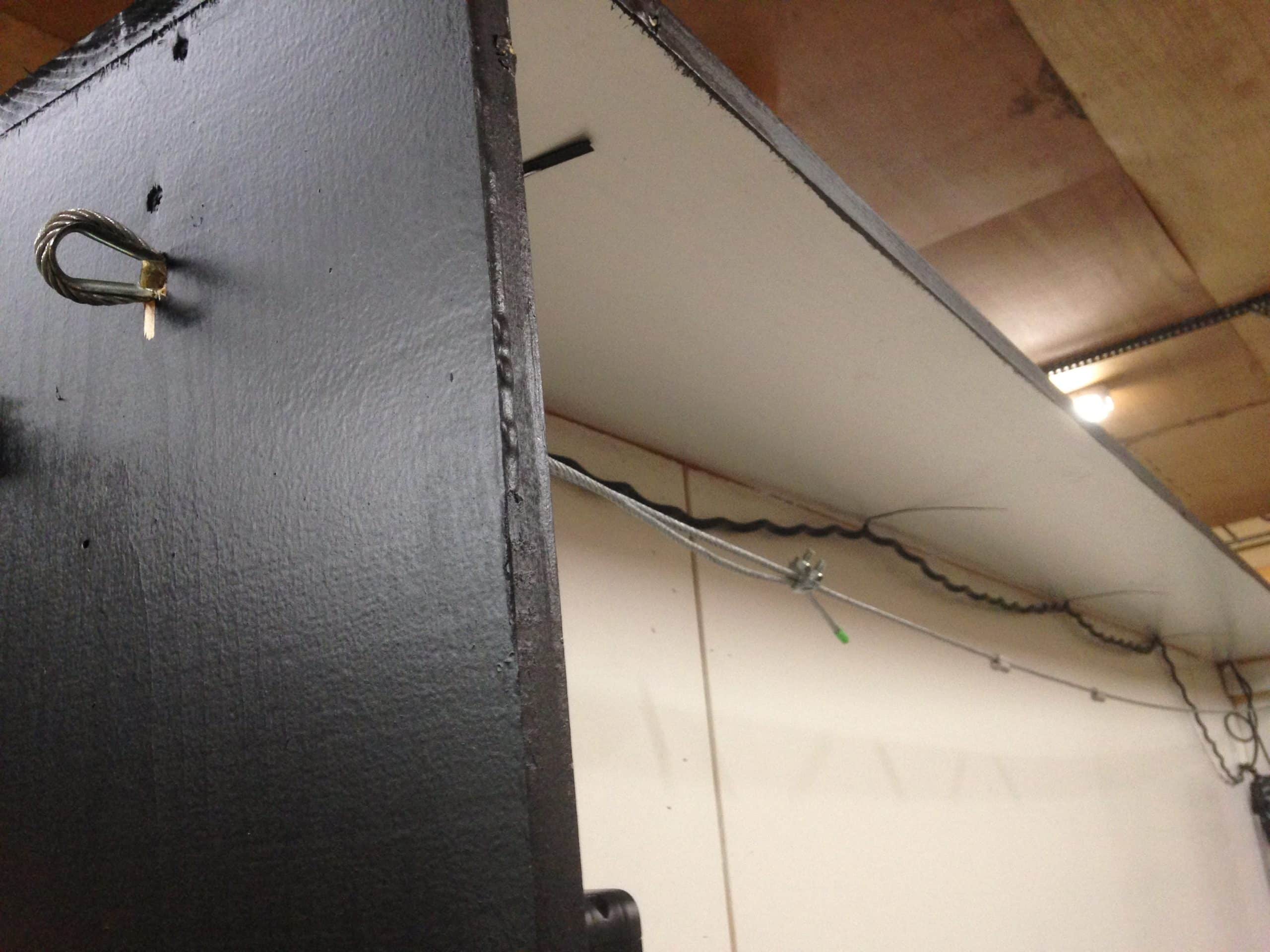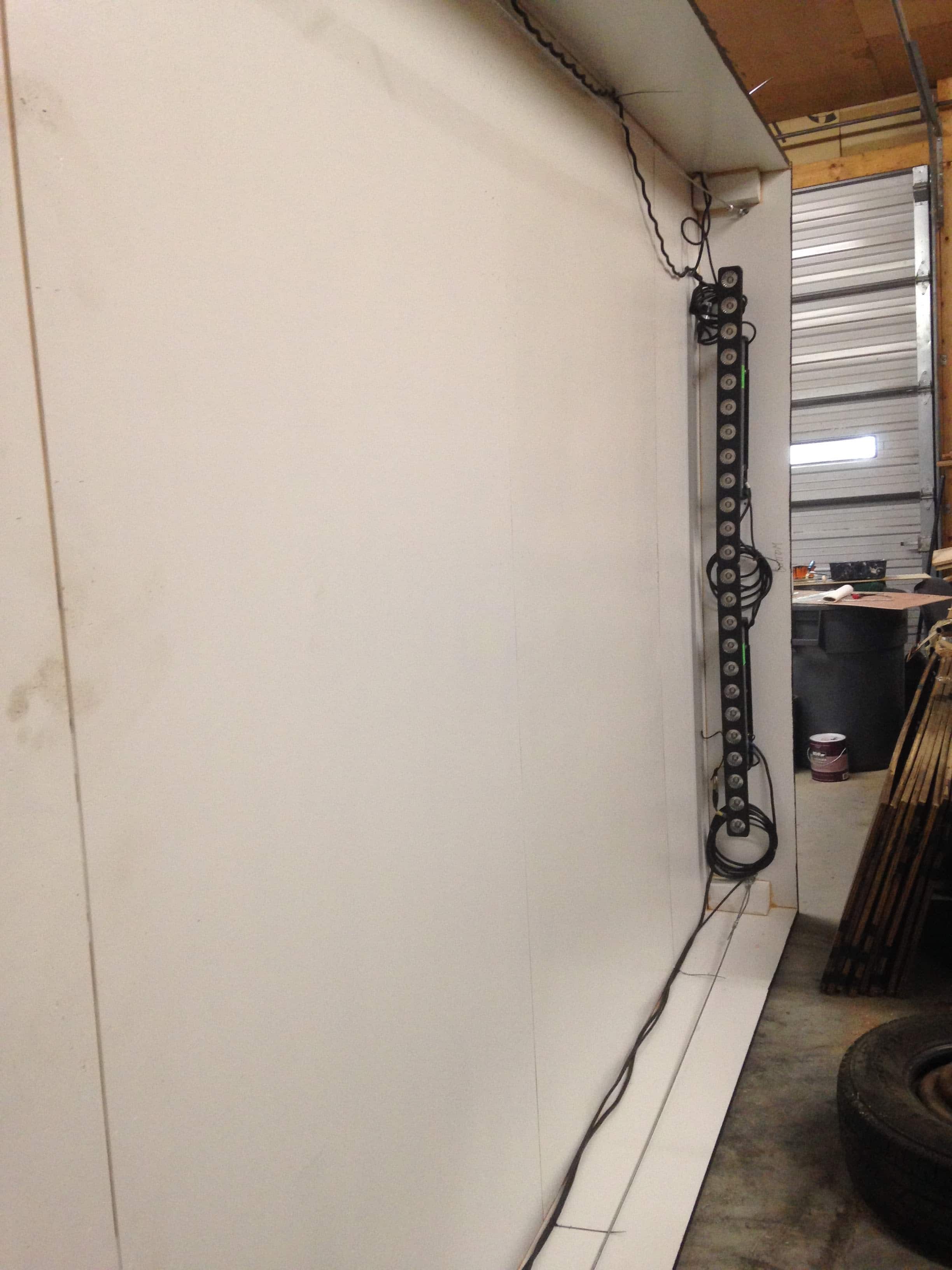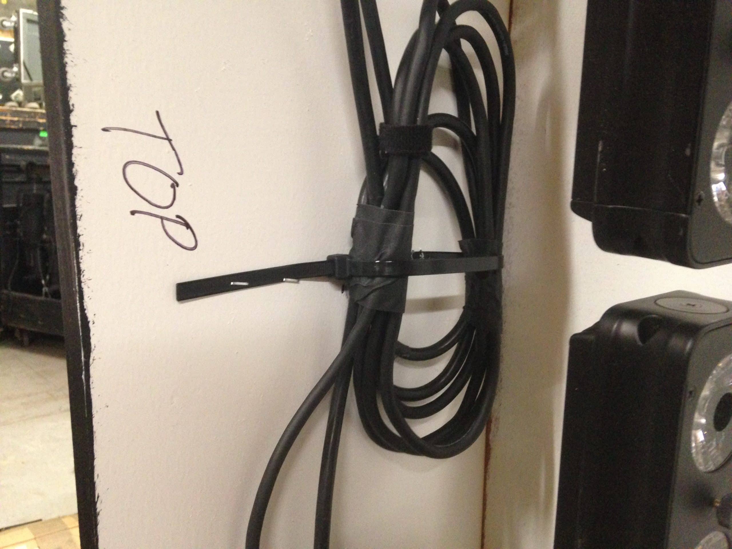 We then installed rigging tethers, LED strips (4 Elation SixBar units) and cabling inside the box, then attached the face. On the back, be sure to make so the bottom and top panel are removable so you can access your LEDs. We also integrated cabling to attach 4 moving washes (4 Chauvet R1 units) to the outside edges. Make sure you secure your cabling so it does not dangle, keep it fastened to the edges. We used zipties and stapled the zip ties to the 1x12s.