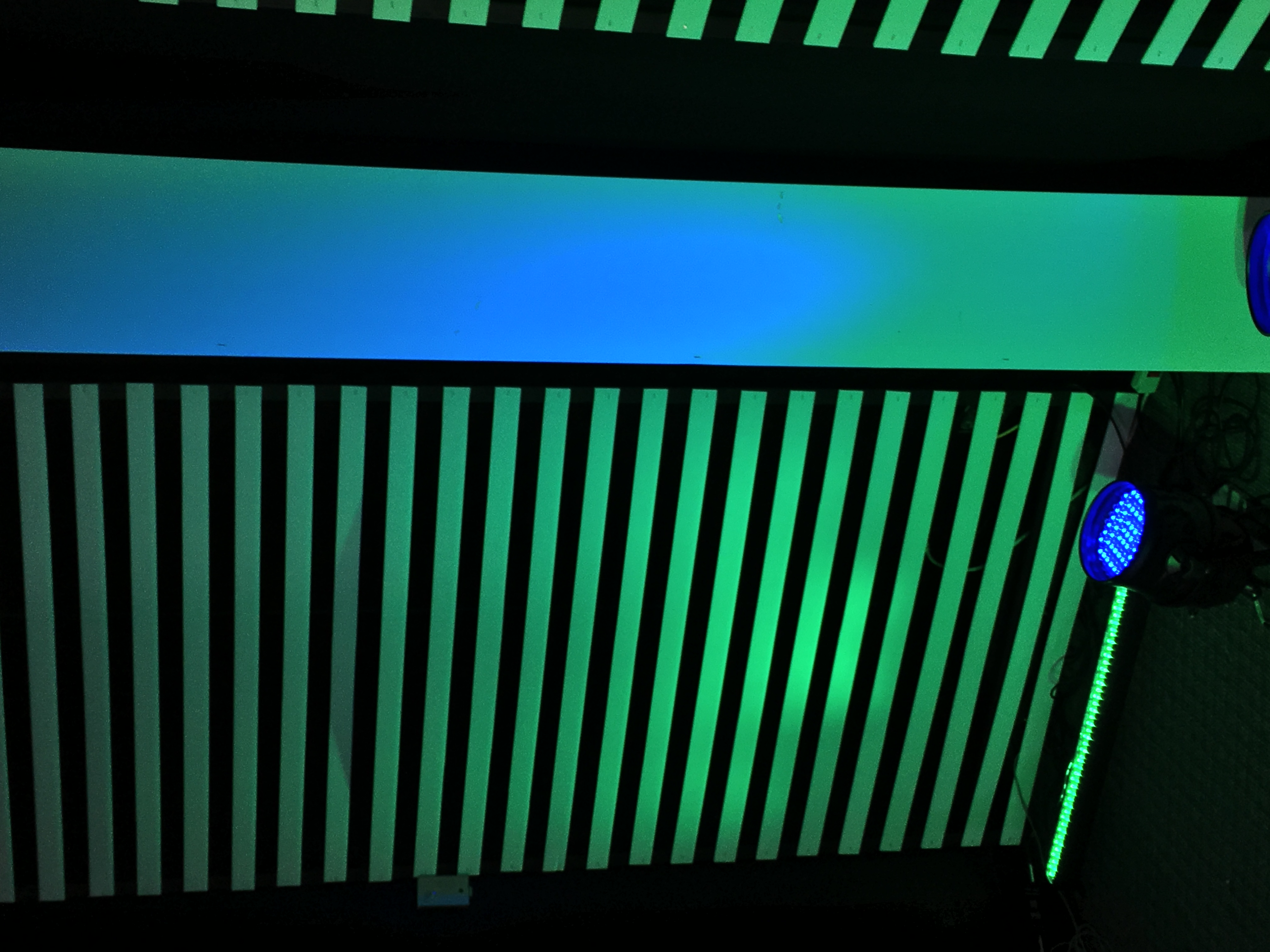 The stripped sections were lit with mega bars from the floor, and the pillars were lit with LED par 64’s. They also had 7 RGBW par 64’s on the ceiling coming in to flood the entire stage.