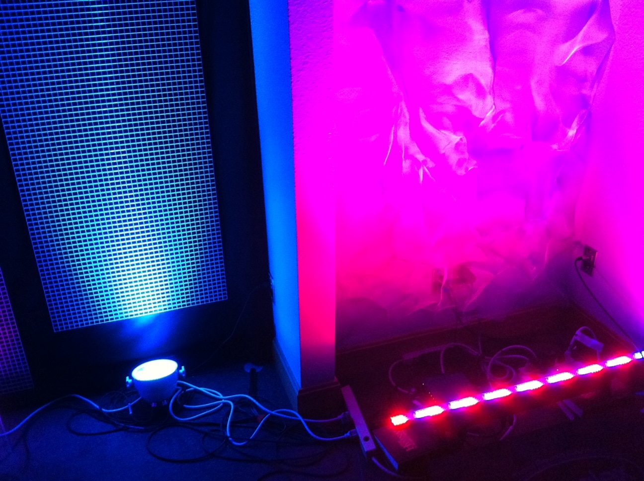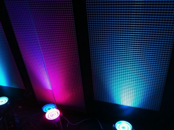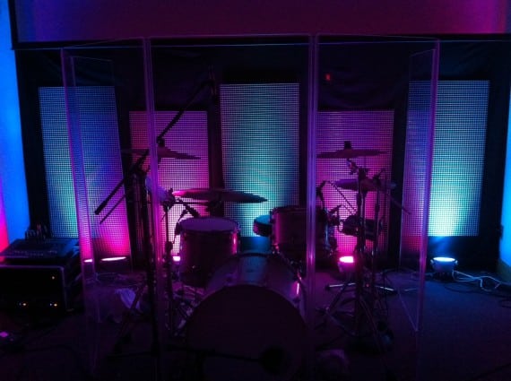 On a trip to Lowes, they bought some aluminum screening (about $30) and white plastic ceiling light grids ($10/each) to see what they could do with them. They hung the aluminum screening in columns along their back wall and lit them with Chavet COLORstrips. Then they hung some black fabric on the back wall and put the grids in front. They lit the grids with Chauvet LEDsplash 196’s. Pretty cool use of the materials!