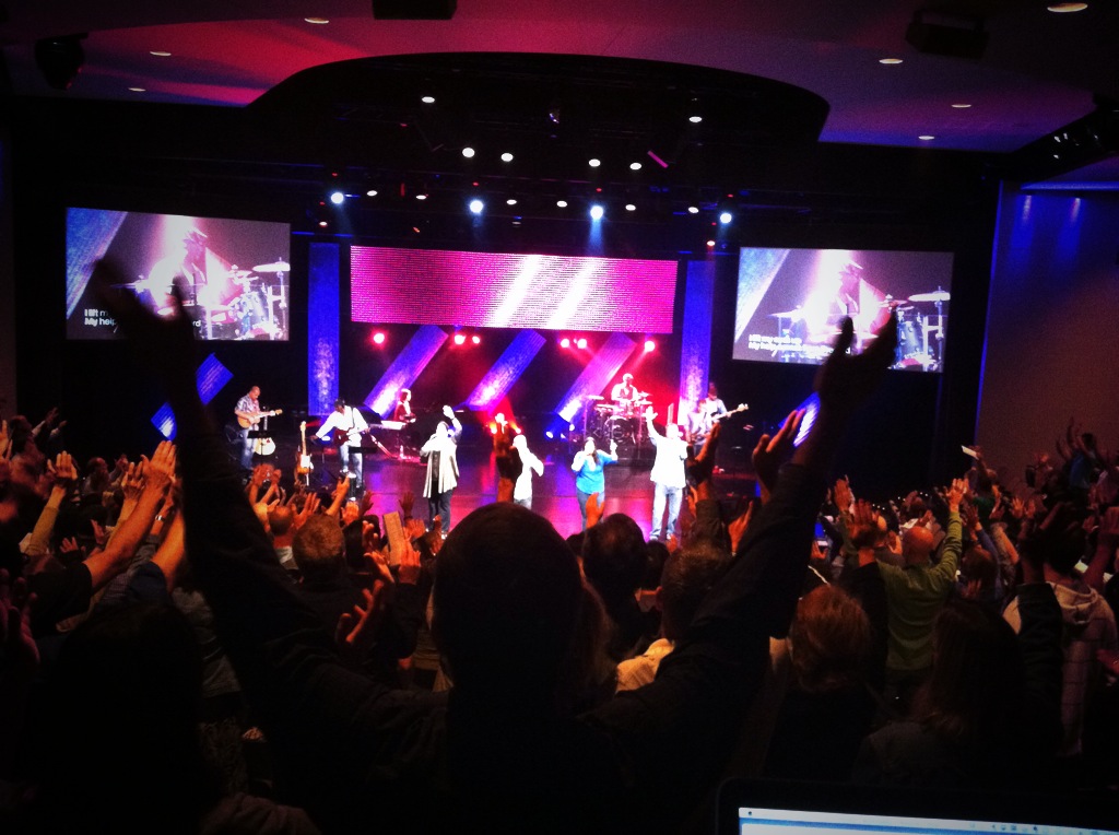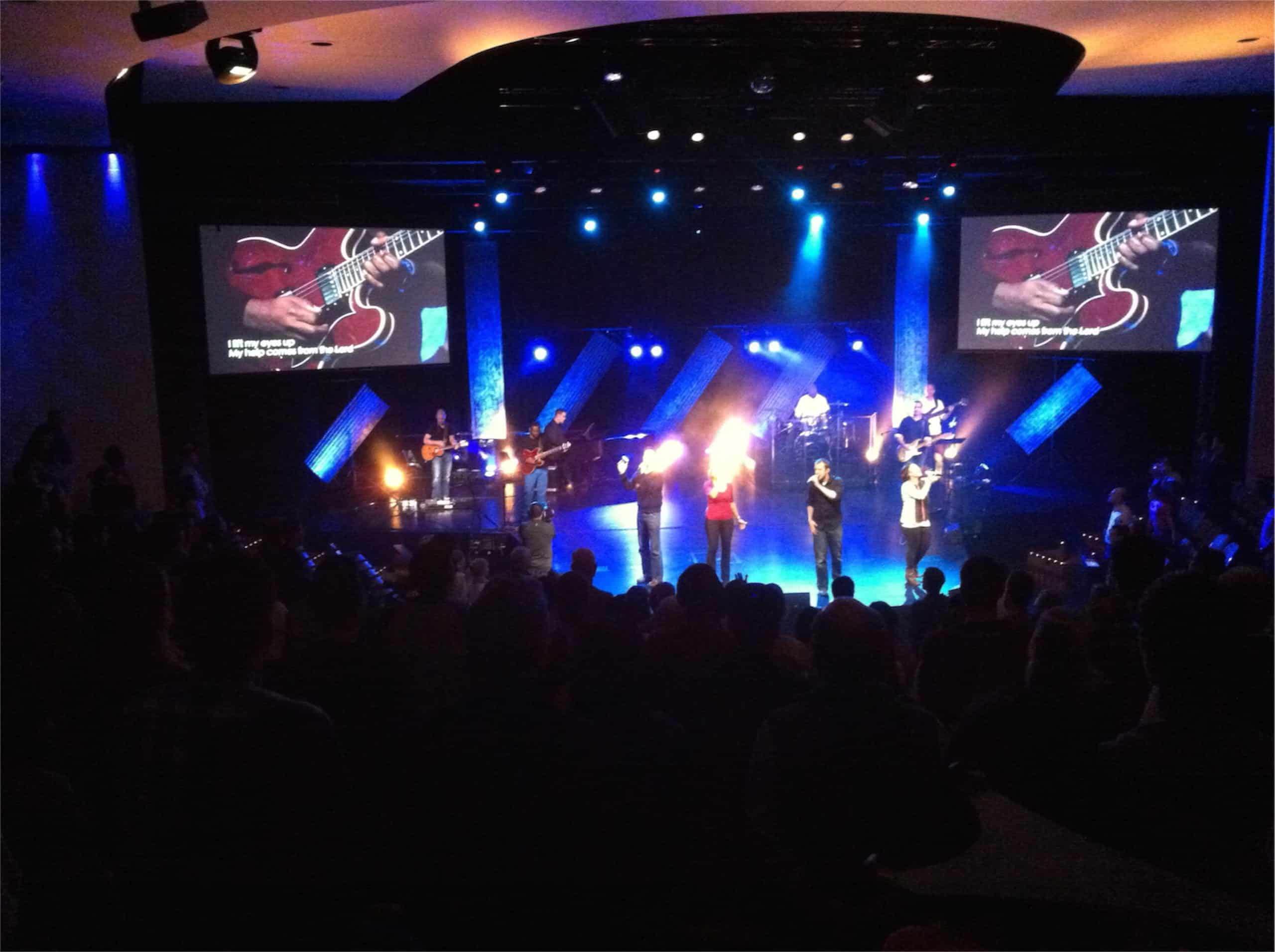 They needed a simple and energetic design. These stage elements were made from fiberglass roofing panels ranging from 6 feet to 15 feet long and about 2 feet wide. Each one was hung with 2 aircraft cables and gliders to allow easy adjustment of the panels. They were up lit with Chauvet Colorado Tour 1s on the floor. Other lights included Robe 136LTs, Martin Mac 250s, Elation Design Wash 250s, and good old fashioned par cans on the floor, providing a great tungsten swell when needed. The set was completed with a 5 foot x 20 foot LED curtain that was fed environmental content via ProPresenter.
