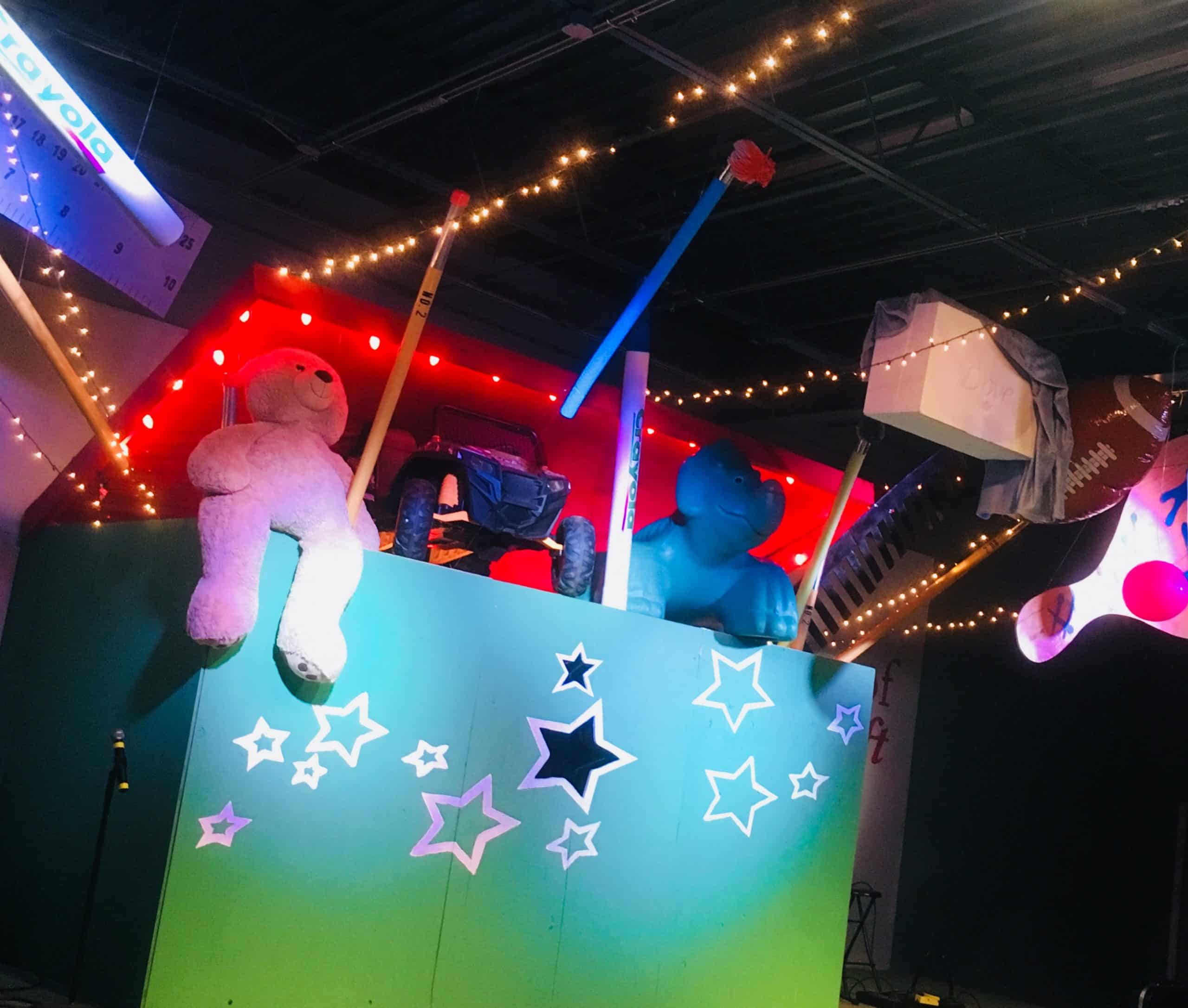 For the set we started by turning our drum cage into a 7 ft x 7ft x 14 ft shoe box. We framed up the box with 2 x 4’s added plywood and painted it green. The lid was made using (3) 2 x 8 x 14, 2 x 8’s – that were donated by a church member they had laying in their barn. We cut one of the boards in half and had our 3 sided lid, we attached the 2 sides to the back of the box and suspended the lid using chain and attaching it to our trusses in our building. We purchased a tarp and stretched it tight on the lid and stapled the perimeter. We then painted the tarp red to match the lid. The tarp was tight enough to use a roller.