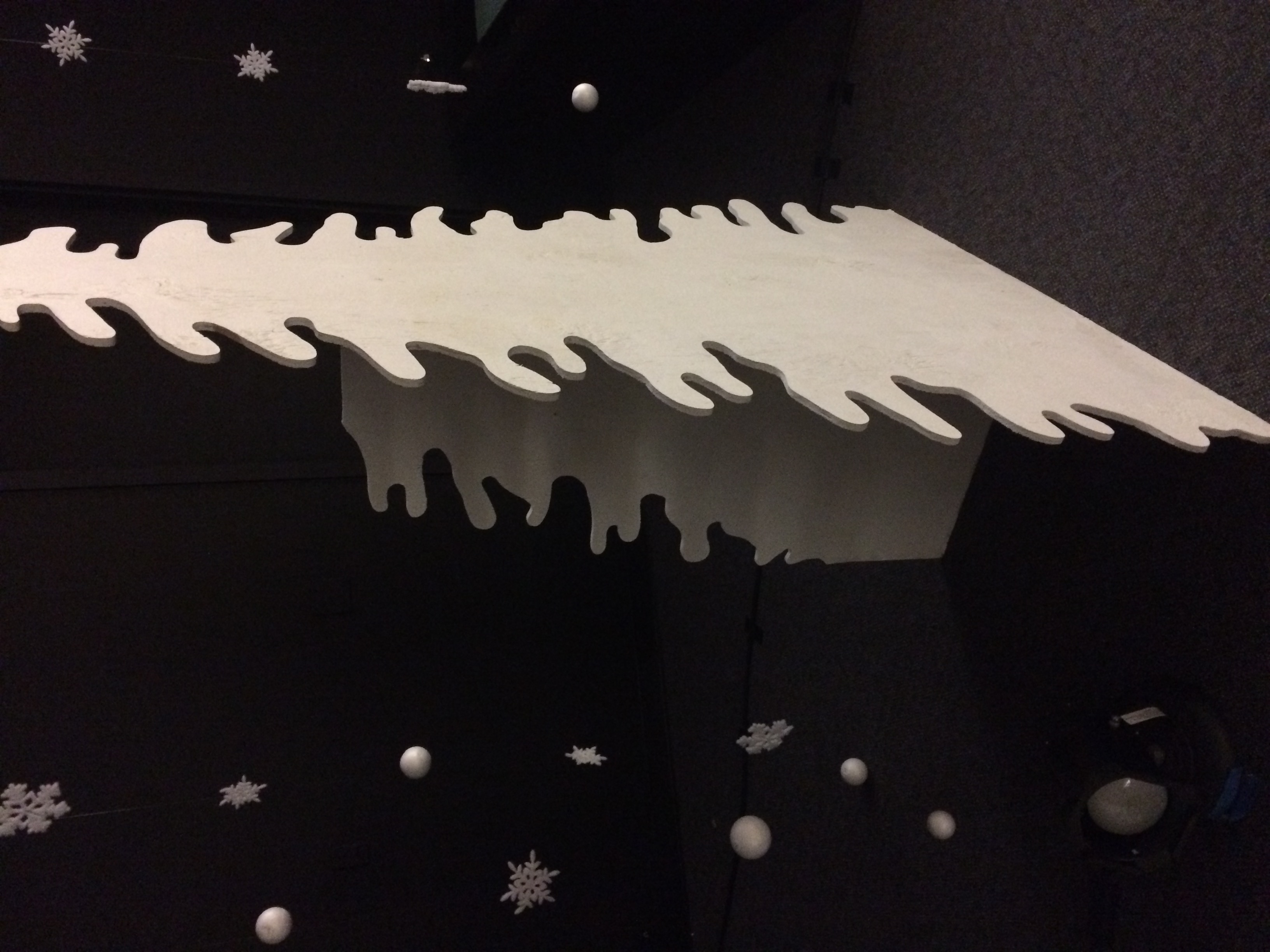 The trees they saw on Pinterest and they had a few guys free hand on a 4×8 sheet of plywood, using a jigsaw to cut them out at lengths of 6,7 and 8 feet. They used the leftover wood that had already been cut out as a stand by screwing them to the backs of the trees. This gave them a 3D look from the side. They painted the trees flat white.