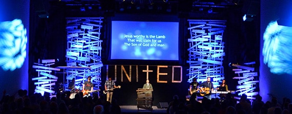 The letters UNITED were made from palette boards, the “T” was also doubling as the cross. They lit these sections with three Source 4 ellipsoidal fixtures focused on “UNI” “T” ED” separately so they could emphasis the cross or the whole word.