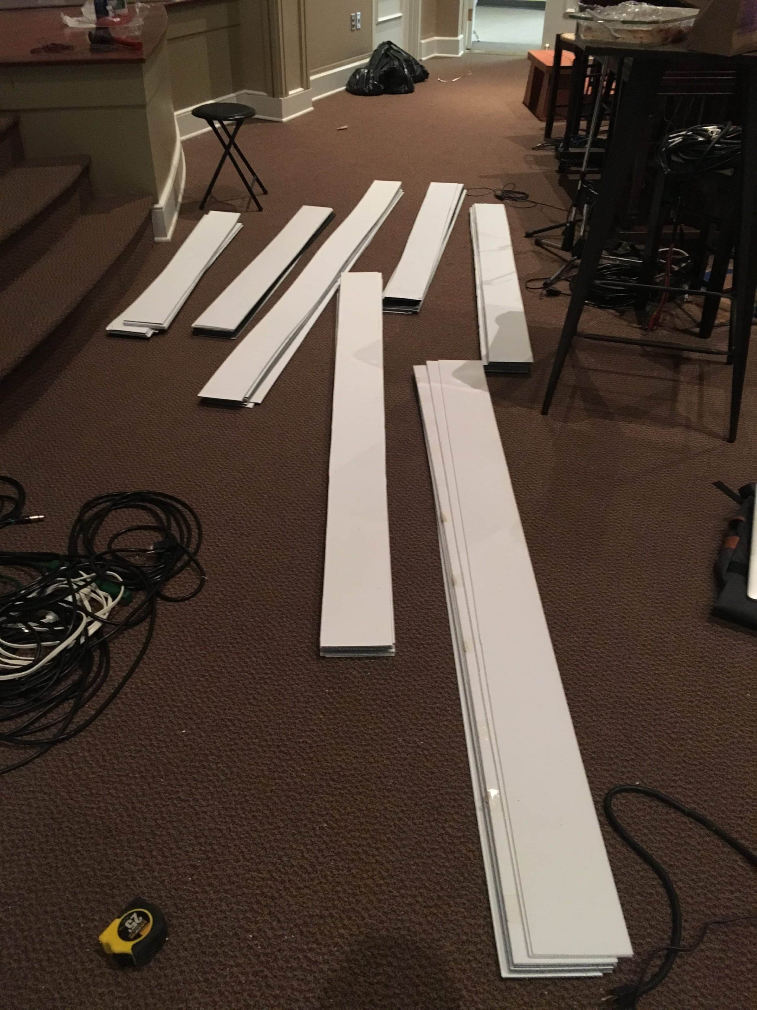 They already had framing for a back wall built from a previous set, so they were able to use that — 10ft high, 2 foot centers using 2×4’s. They cut strips of Coroplast roughly 6″ wide in varying lengths, spaced them about an inch apart, and attached them to the wall using velcro in three 4 foot sections. Their stage is rather shallow, so they wanted to create depth. To help with this, they built two walls on the front wings of the stage, and added two more sections of Coroplast there. They used 38″ LED bars to light each section.
