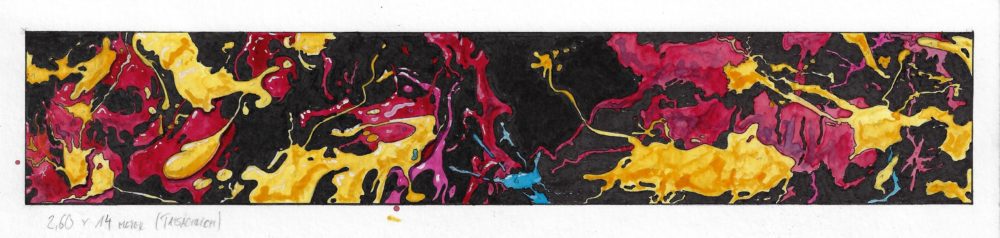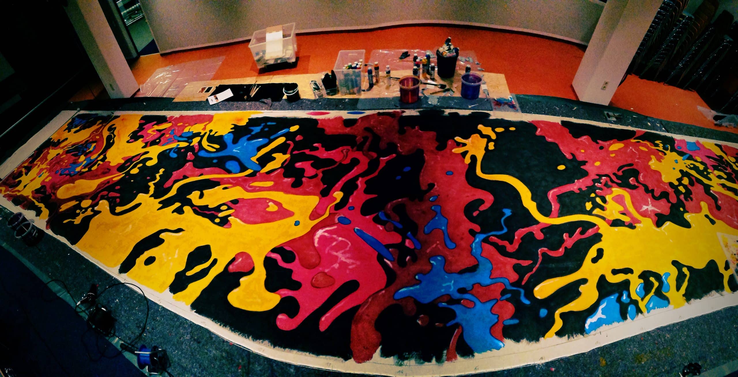 The design was sketched with charcoal using a string grid to scale, then inked black with brushes on long bamboo sticks and then colored in.