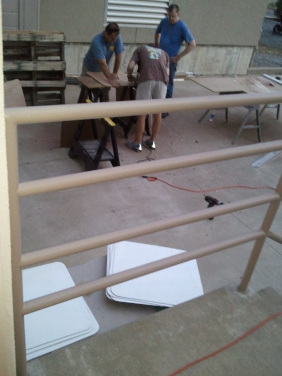They made a template with the edges rounded and a jig so they could stack the pieces and round them accurately and consistently. They cut the pieces on a table saw, then rounded them with a router and a flush-cut pattern bit. They sanded the edges since the enamel paint can leave edges sharp enough to cut you.