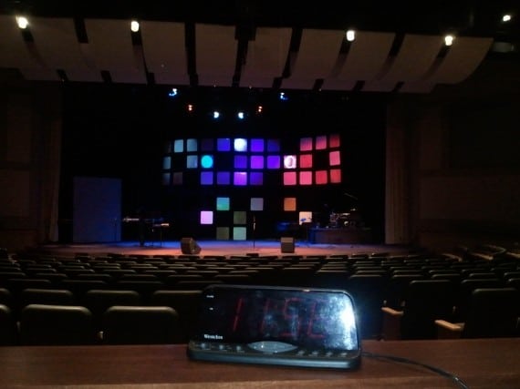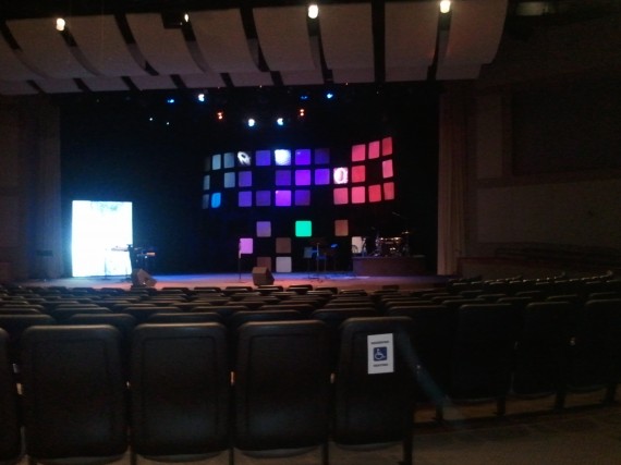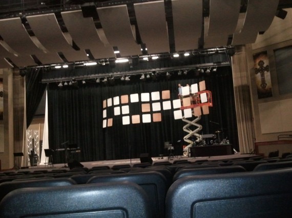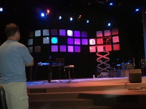 The stage cost around $700 but they reused the grating for several different stages to suspend staging pieces at the back of their worship space.