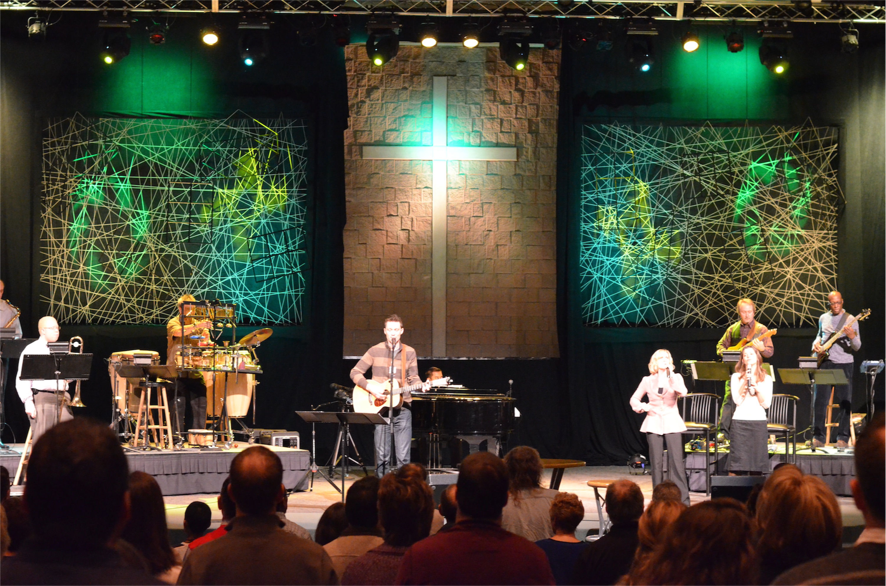 They had an original vision for the stage, but midway through the project they realized it wouldn’t work. They already had the 9-foot by 12-foot 2×4 frames build. When they added the web of kite string (already owners) and window grids the plan fell together.