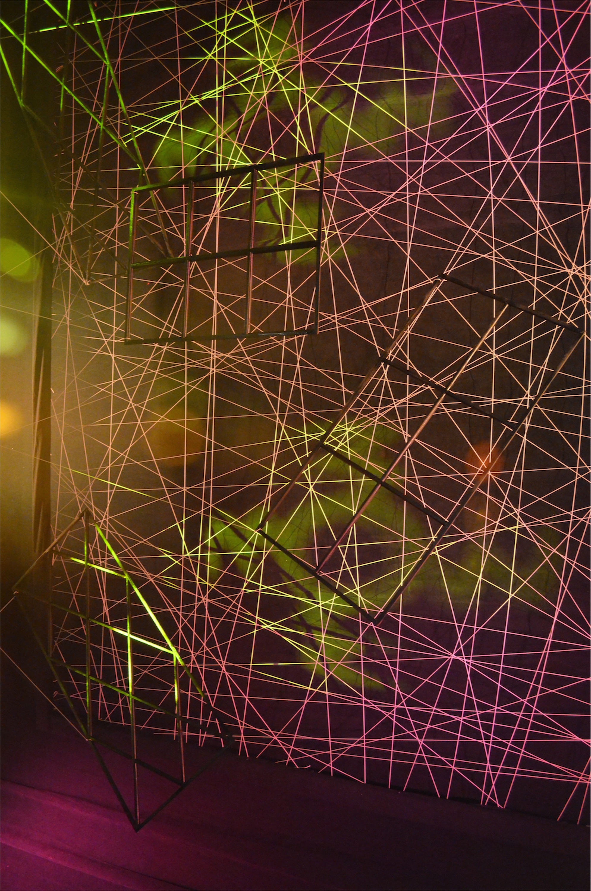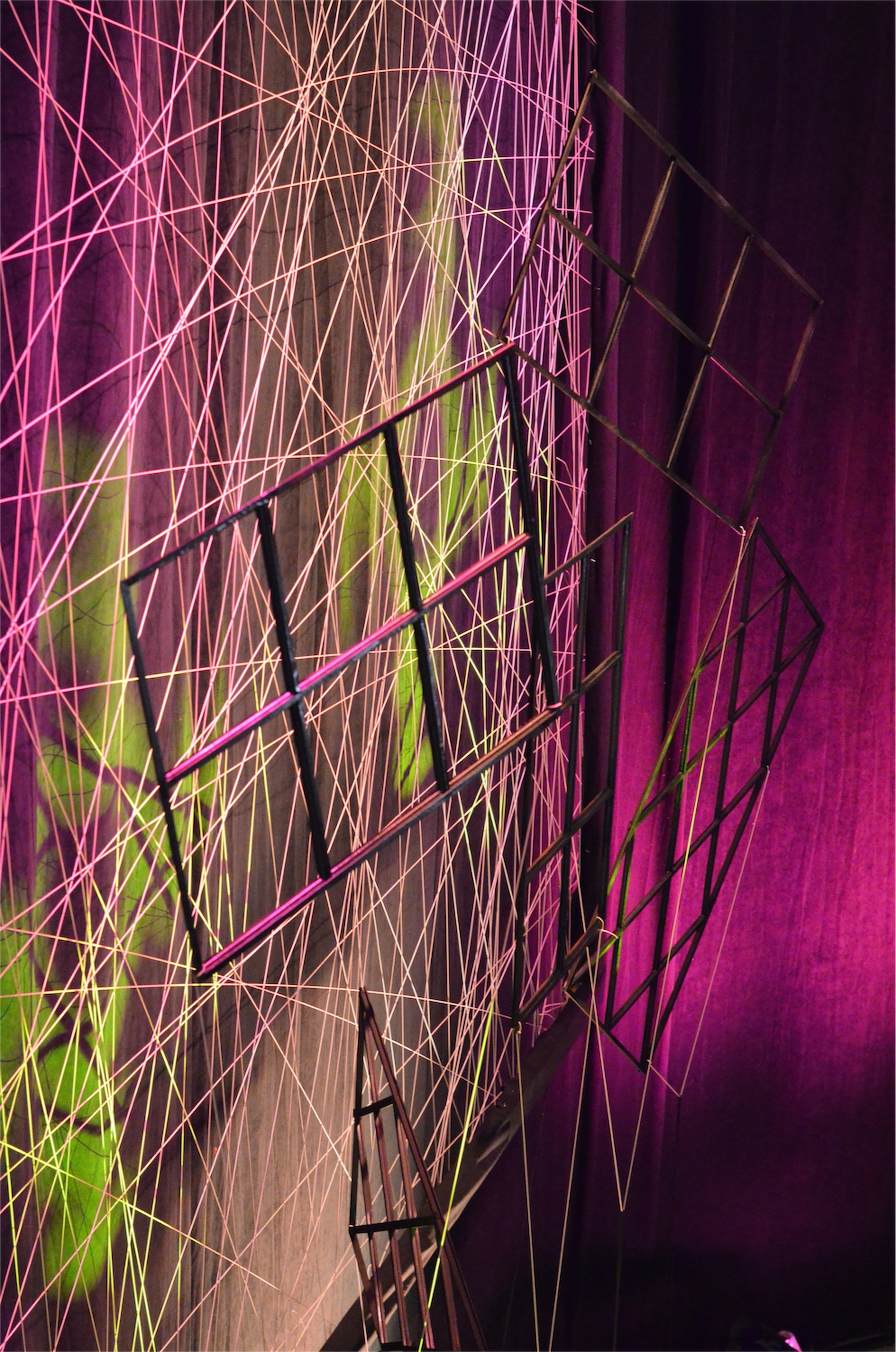 They made the frames out of 2x4s then covered them in black fabric that matched their black curtain. nd then cover in black fabric that matched our black curtain. They took fencing staples and hammered them in about 3 inches apart. Taking the kite string, they strung the string through the staples in a random order and continued the process until the desired “fullness” was achieved. After spray painting the window grids, they hung them a foot or so in front of the strings and at different angles. The web of grids was lit using LED lights from the bottom and using their intelligent lights to create patterns on the strings.