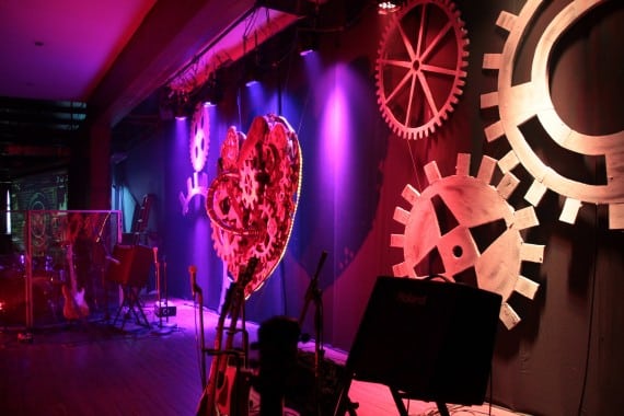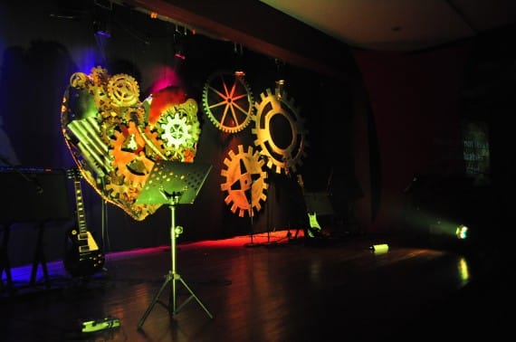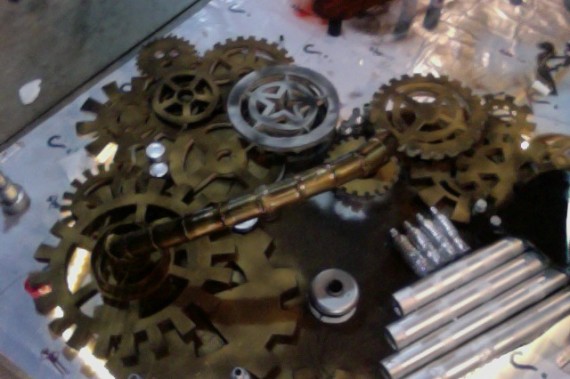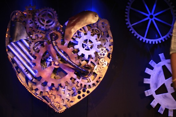 The two largest gears in the heart were rotating in opposite directions. This was made possible by using the small rotating machine in small disco balls and attaching them to the gears to make them move. Cool!