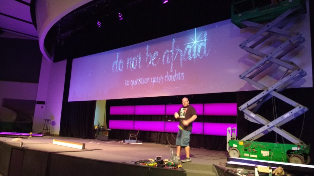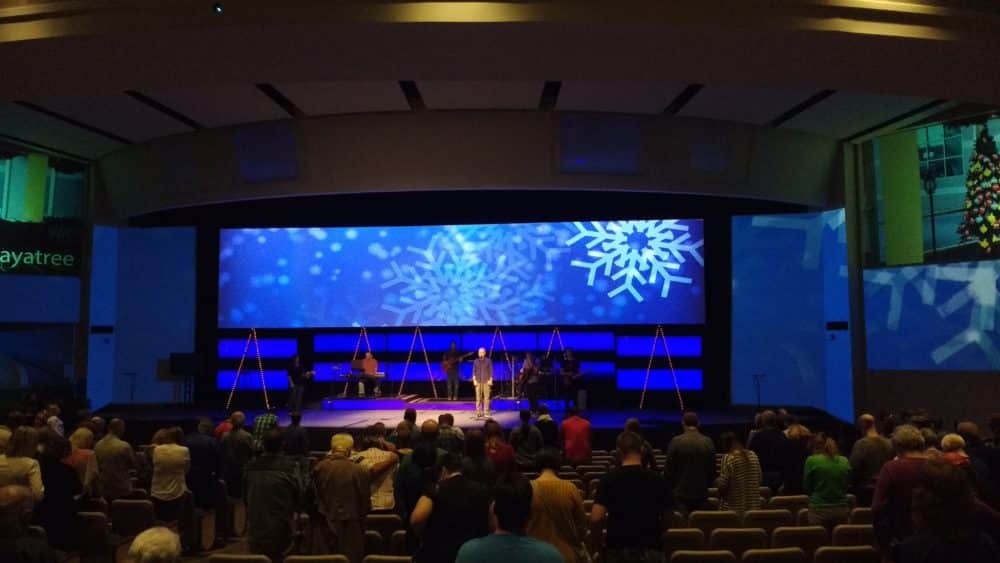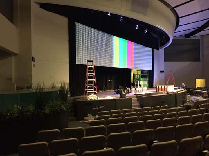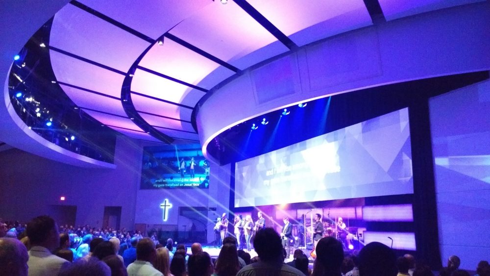 After that, they hung lights (they owned 16 Elation OptiTri Pars already) on a bar behind the screen to back light the band, and on the band risers primarily for beams in the haze. They purchased 5 Elation SixPars, and hung them over the singers downstage. They also salvaged from their stock 2 Elite Servo Spot 250’s for a little motion, and texture. Note: Some of the pictures shown are from Easter when they overlayed 6 Clay Paky Sharpy fixtures to supplement the rig. The rest of the lighting are conventional Source 4 Lekos, and ParNel fixtures. They control it with Jands Vista S1 on 2 universes.