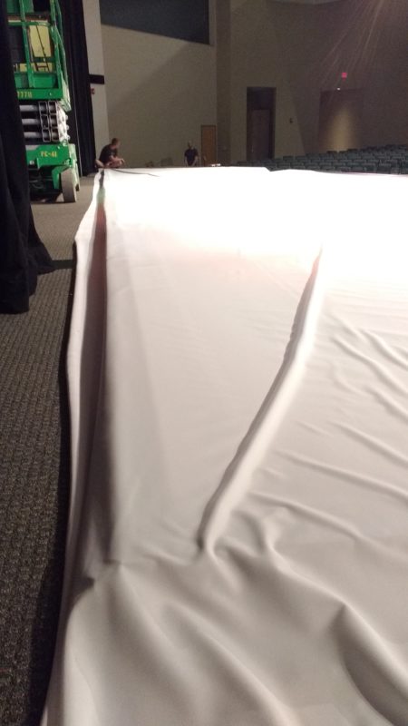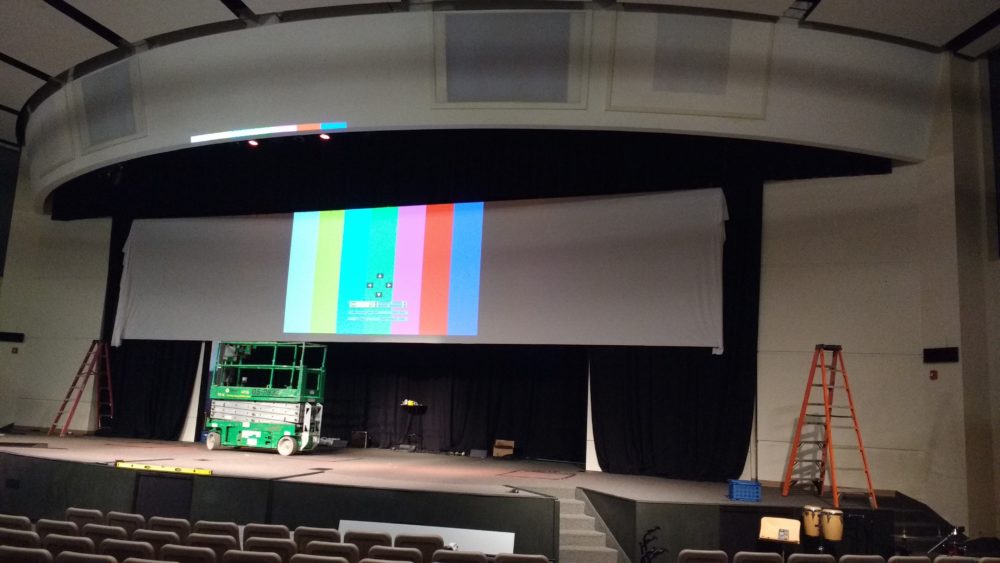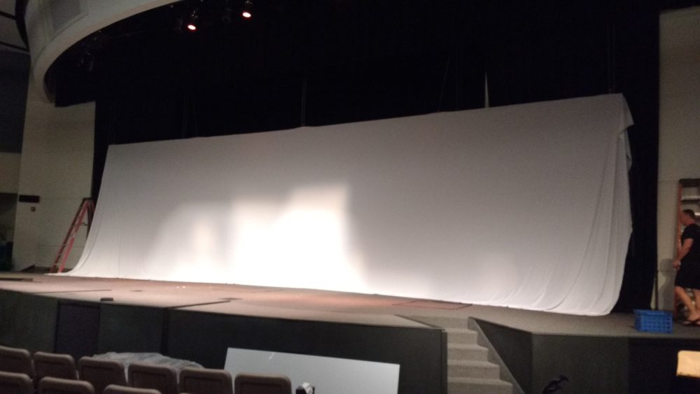 The screen is a porous material made for projecting on (no seams) from Rose Brand, stretched across a 32ft x 10ft frame made of 1x4s, meticulously stapled on the back to prevent wrinkles on the front. They hung it all with chain hoists purchased at Harbor Freight on various hang points (some lighting bars and structural steel depending on need. Then adjusted for level. Using ProPresenter, they have the TripleWide Module installed and edge blend 3 projectors for a smooth, beautiful look. They use some custom, and some TripleWideMedia.com motion backgrounds. Paired with that are two white walls that they project on to create Environmental Projection.