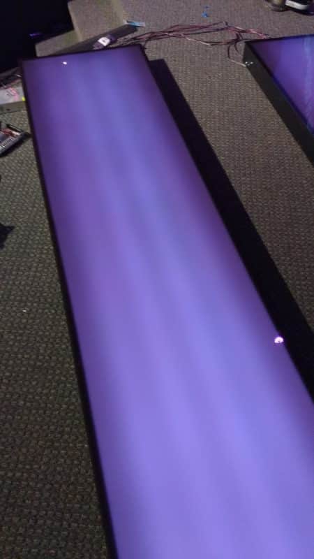 They used luan and 1X4’s to make 8ft x 2ft boxes. Then they used 4 strips of 24 volt LED tape inside each box spaced 4 inches apart, spanning edge to edge, longways for even coverage (sectioned into pairs to give more control and color options), cut to fit. Then they used 2 pieces of acrylic to diffuse and douse. The first was a foggy piece to diffuse the effect. Then the second piece was charcoal to dim it since the 24v tape was quite bright. As an added bonus, it makes the boxes almost completely disappear when they are not on!