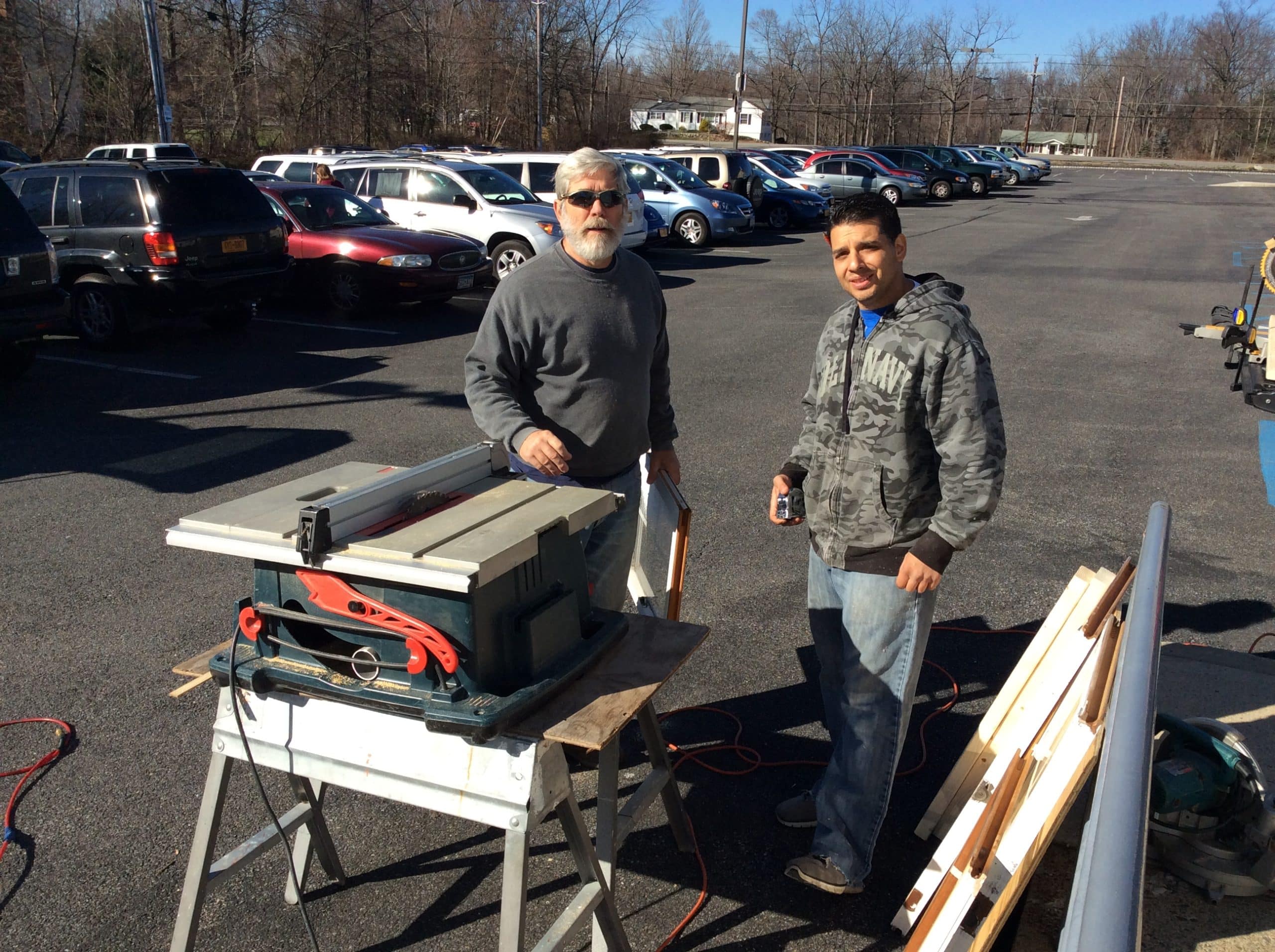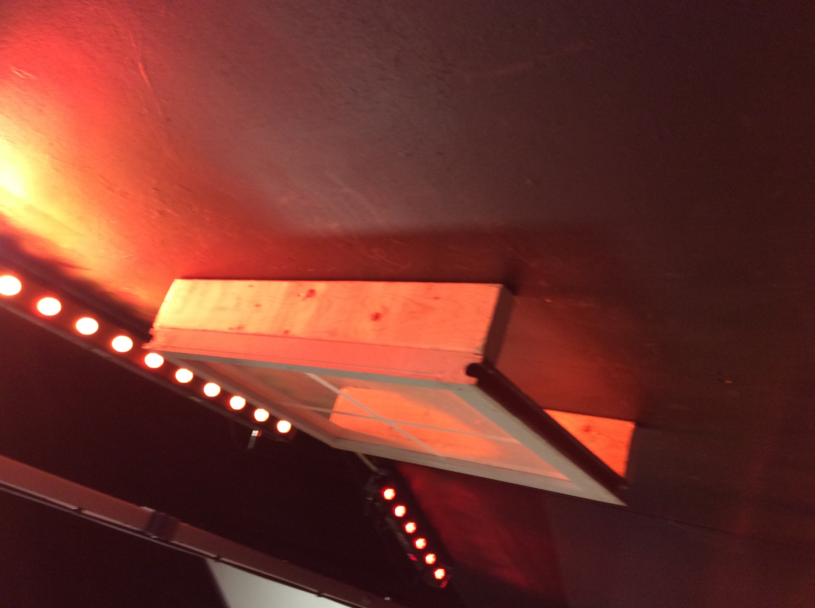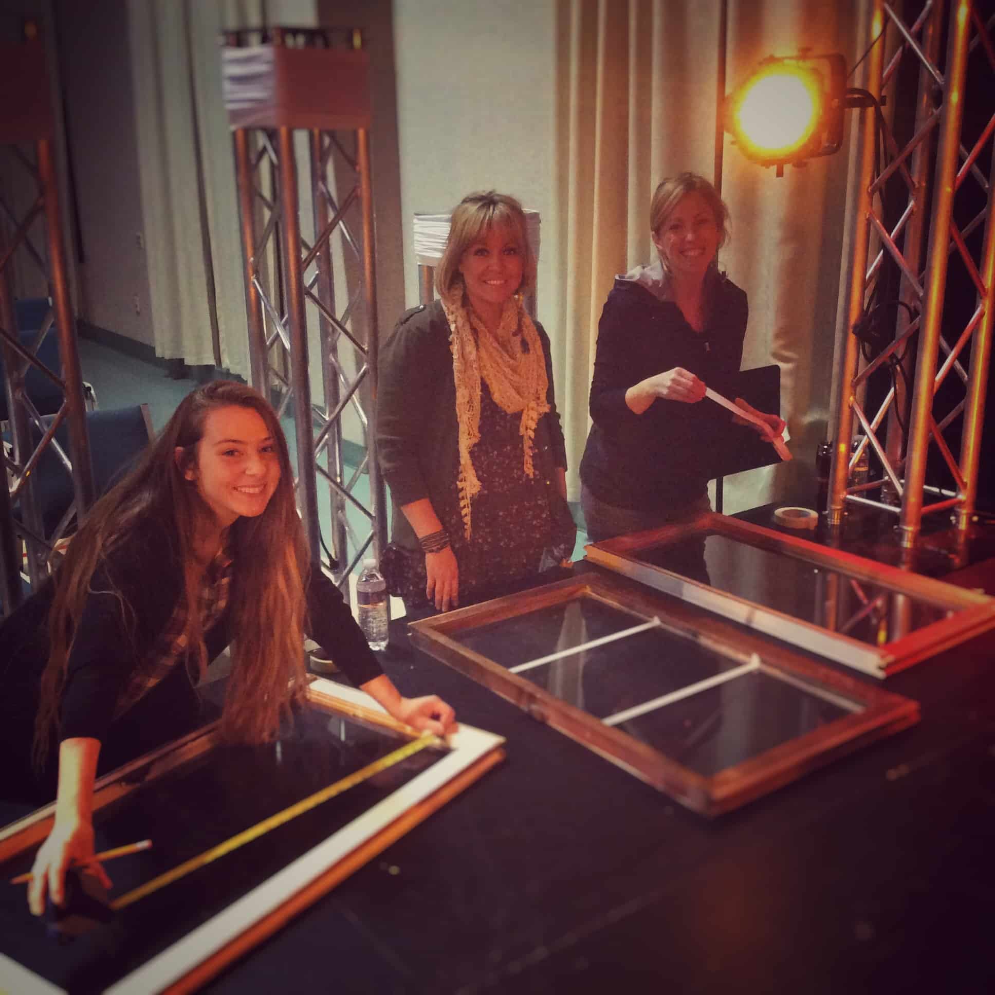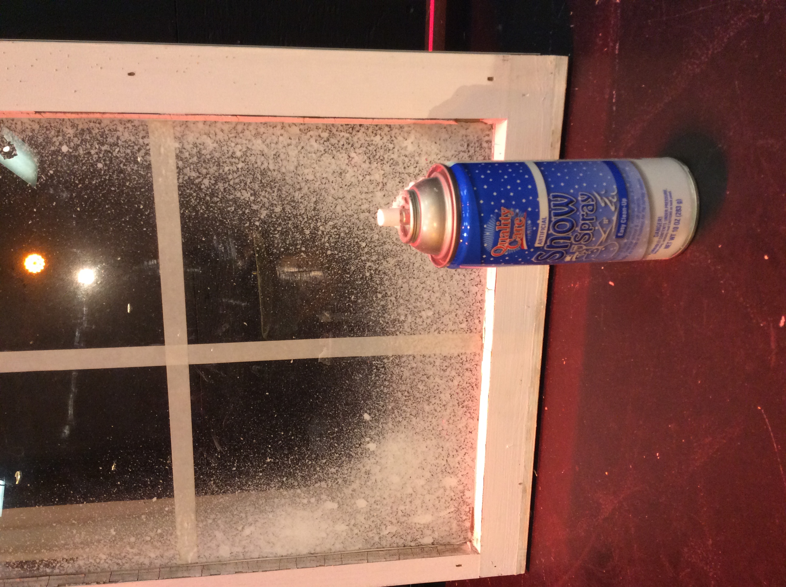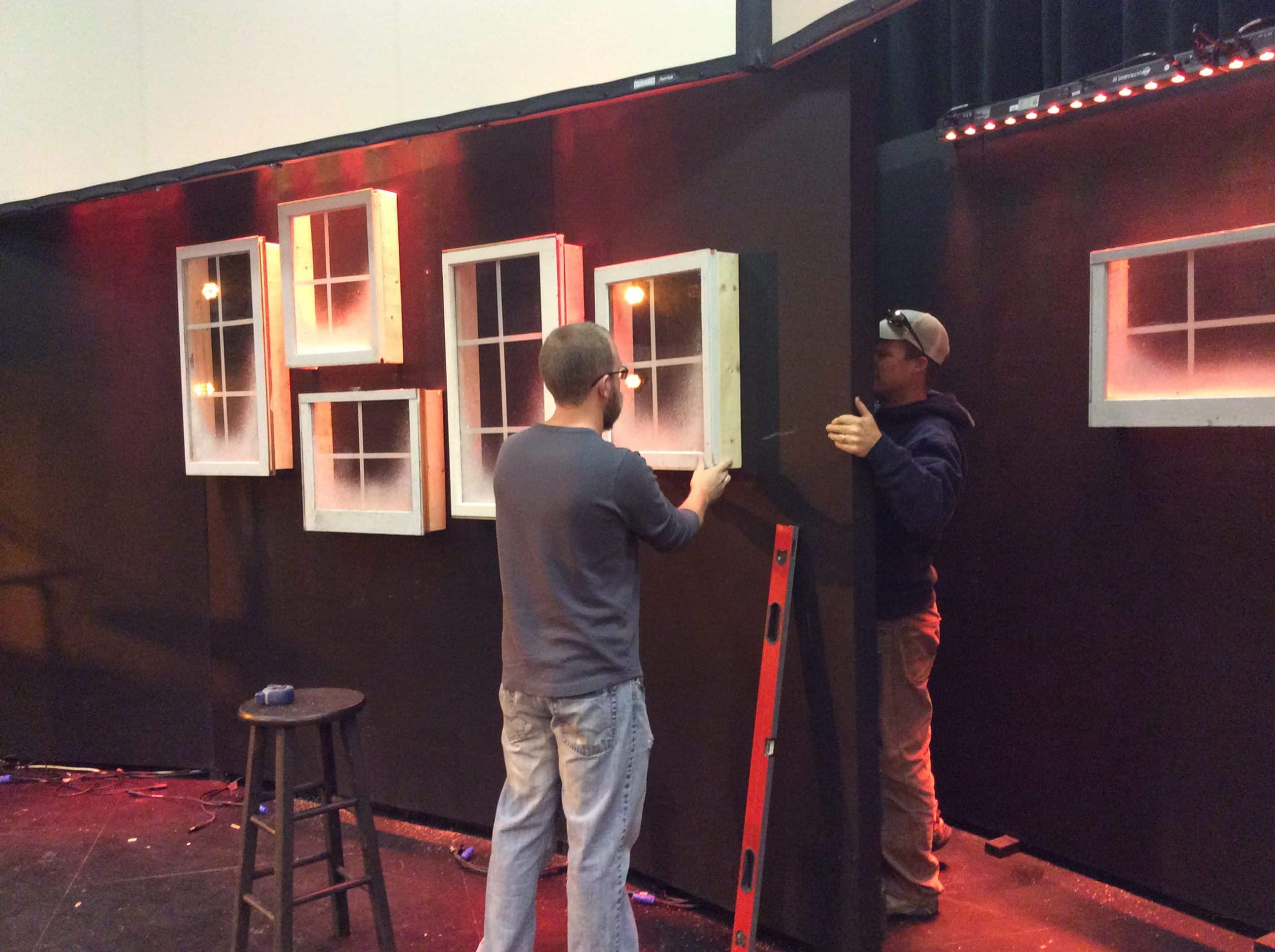 First they went dumpster-diving. They garbage-picked some old windows from the side of the road. After they cleaned off the old spider webs and exoskeltons from the windows (gross), they added 1″ masking tape to the glass to create a “window pane” effect. Then, they cut 2x4s and brad-nailed the wood to the sides of the windows only to use as stand-offs from the stage flats. Next, they sprayed snow-spray (air canister form Lowe’s) on each window and bolted the window unit to the flats. By making the windows stand off 4″ from the flats, the up-lighting created a more dynamic and three-dimensional look and feel.