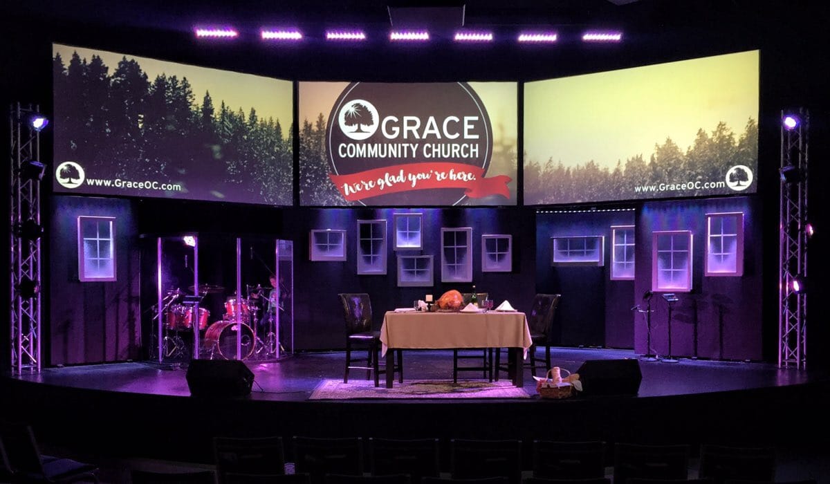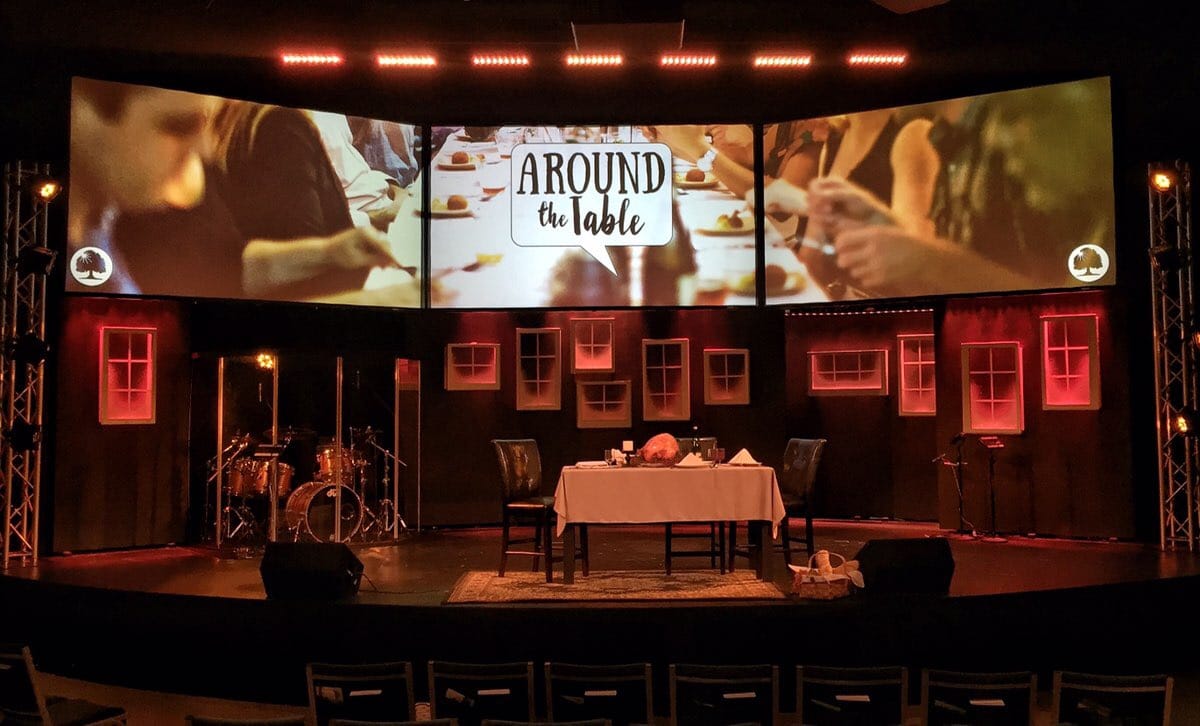 For their upcoming November/December message series, “Around the Table”, they really wanted to visually communicate a “home for the holidays” feel. They decided to implement a more cozy, interior feel by incorporating an actual “set table” as the main stage prop juxtaposed to the hanging snowy window boxes.