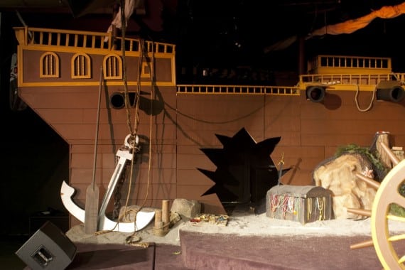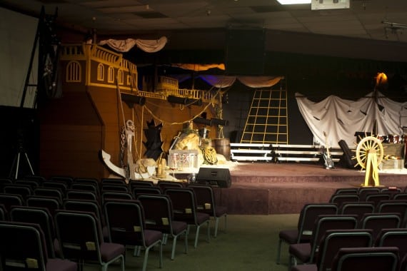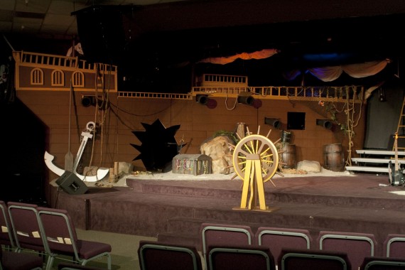 This design was for their Easter series, “It’s a Pirates Life”. To create the pieces they used plywood and 2×4’s to replicated a real ship. And check this out…the choir entered and exited through the cannon ball hole!