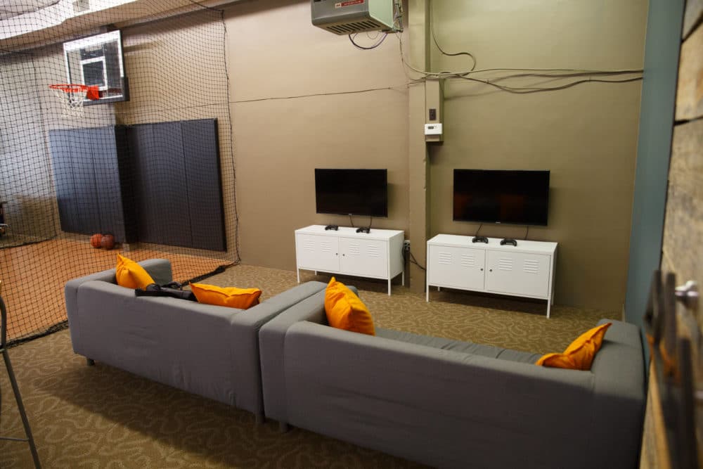 The stage was created using pallets and styrofoam. Then they added other elements to make the room more fun.